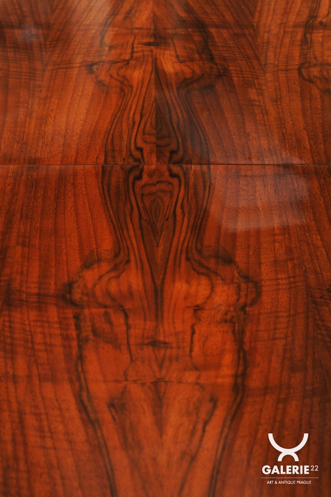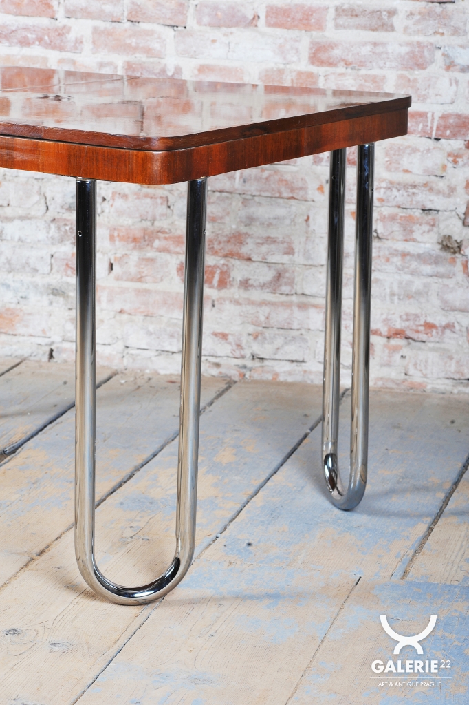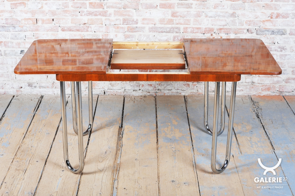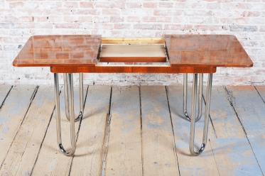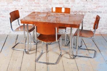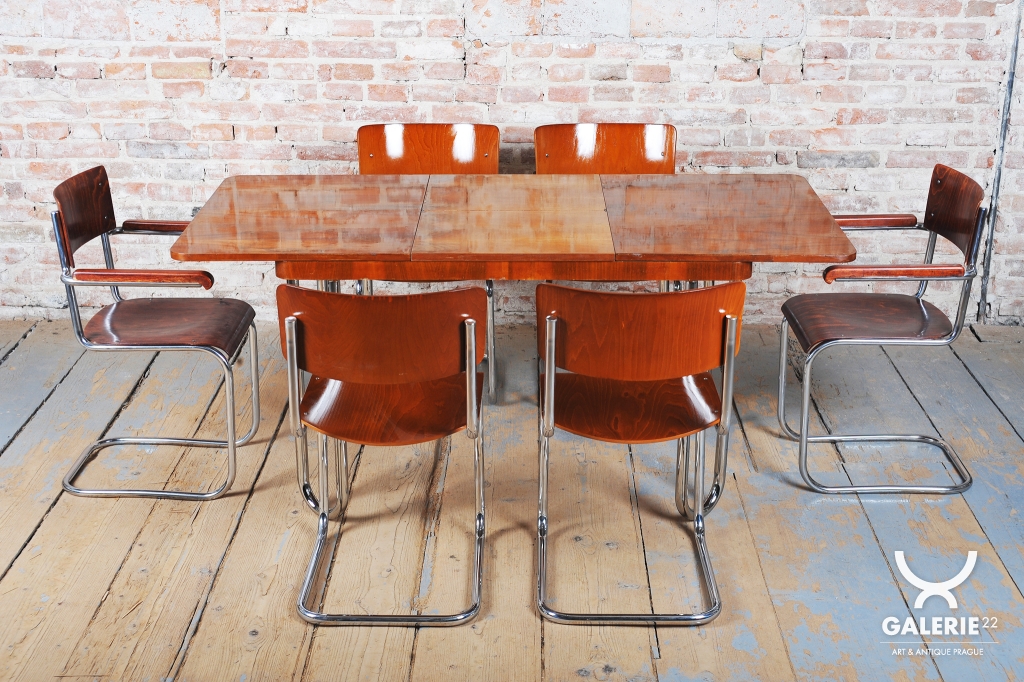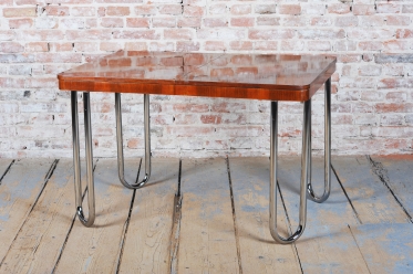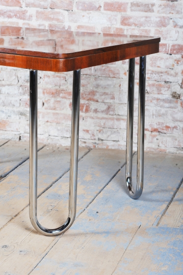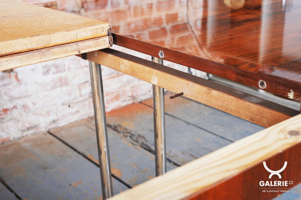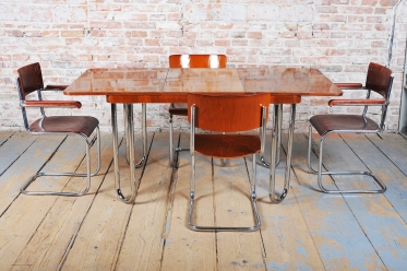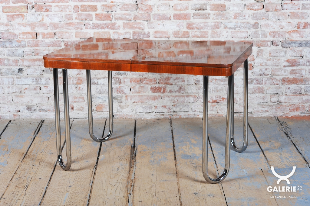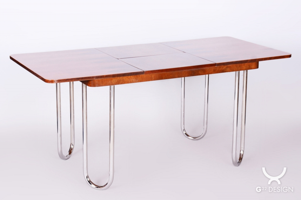 Tento jídelní stůl z počátku 20. století se nachází na pomezí stylů Art Deco a Bauhaus, což mu dodává jedinečný charakter. Navržen Jindřichem Halabalou a vyroben UP Závody, spojuje eleganci ořechové dýhy s industriální estetikou trubkové chromované oceli. Pečlivá renovace vrátila dřevu jeho původní lesk a chromové prvky byly profesionálně vyčištěny, aby opět zářily v plné kráse.