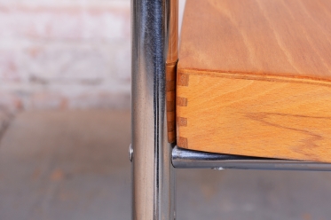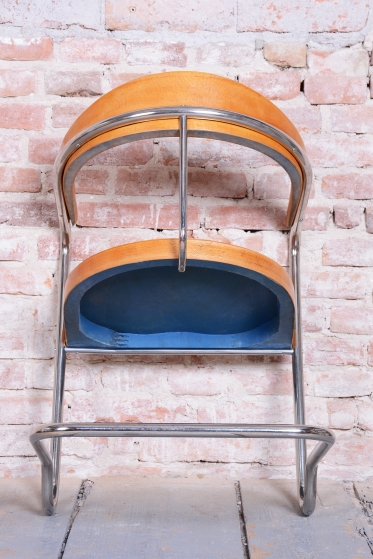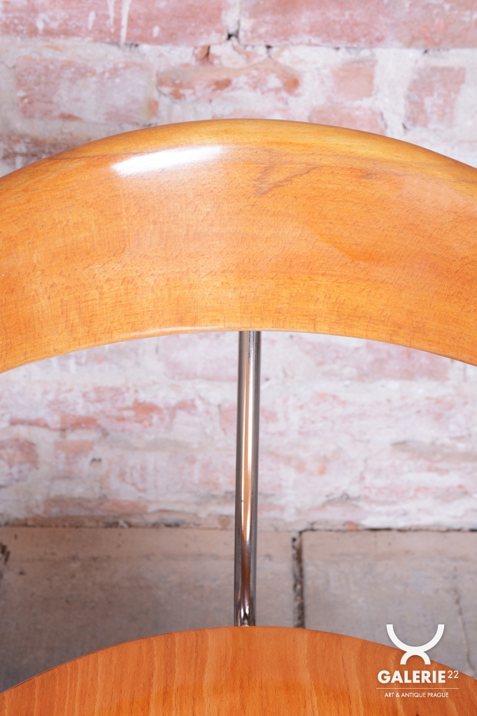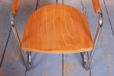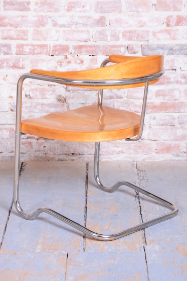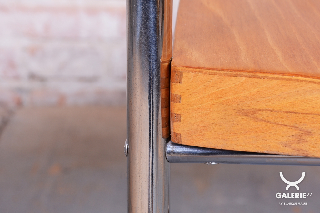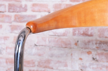 The frame is crafted from tubular chrome-plated steel, which has been professionally cleaned to restore its original mirror-like luster. The seat and backrest are made of beech wood, which adds a warm, natural element to the piece.