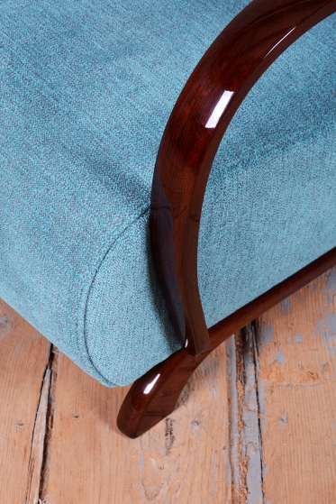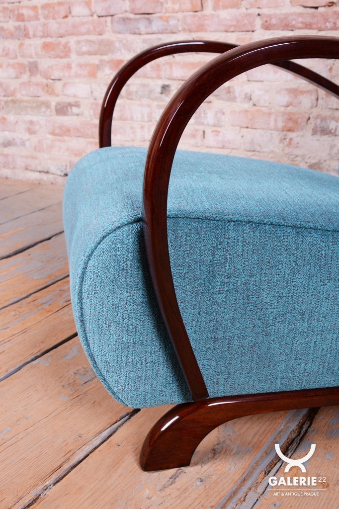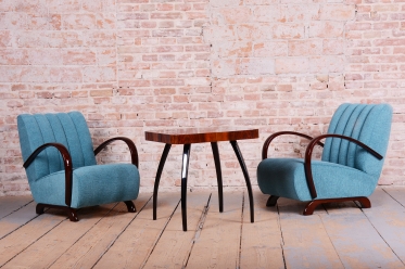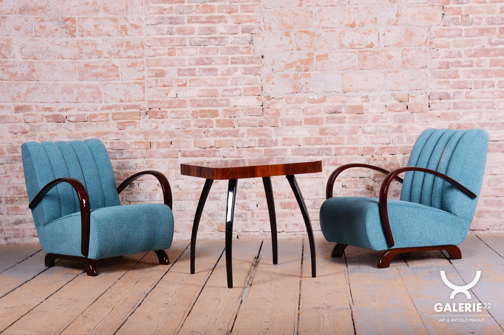 This exceptional pair of armchairs is an iconic representative of the Art Deco style, manufactured in Czechoslovakia during the 1930s. It is a famous design by architect Jindřich Halabala for the renowned UP Závody, ranking among the most sought-after pieces of Central European modernism. The frames, crafted from solid beech, are finished with elegant walnut veneer, whose striking and rich grain gives both chairs their unmistakable character and visual depth.