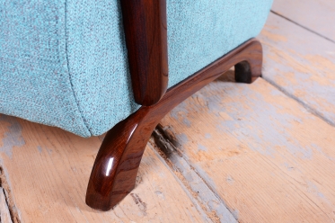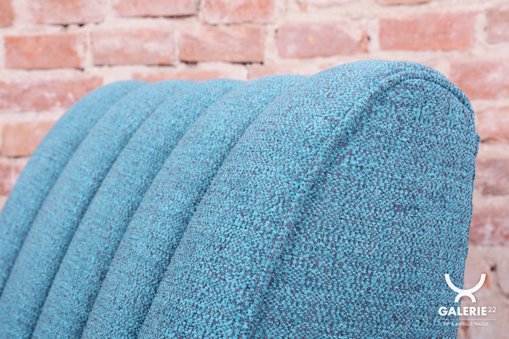 Beyond their aesthetic appeal, the armchairs have been fully restored functionally with new professional spring upholstery. This was crafted using traditional methods to ensure maximum seating comfort while maintaining the authentic silhouette. The new upholstery fabric in a teal shade with a subtle texture harmoniously complements the dark tones of the walnut wood, emphasizing the overall luxurious feel of the set, which is ready for immediate use.