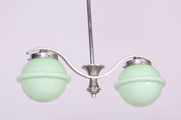 This chandelier is a prime example of functionalist elegance and the Bauhaus movement in 1930s Czechoslovakia. Its design relies on clean geometric composition and high utility. The foundation is a subtle yet sturdy chrome-plated steel construction, which has been professionally polished to a high luster. The uniqueness of this piece is highlighted by two round shades with a 17 cm diameter, crafted from colored opal glass. This colored variation of opal glass is less common, adding a unique character and a warm lighting atmosphere to the strict functionalist form.