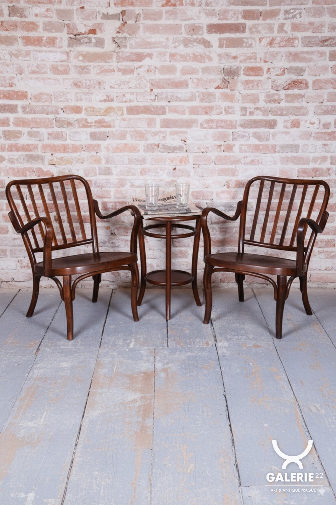 This elegant Art Deco armchair comes from Czechoslovakia from the first half of the 20th century and was manufactured by the renowned Thonet company according to the design of the significant architect and designer Josef Frank. It is crafted from stained solid beech wood.