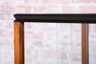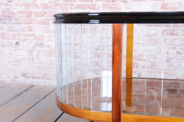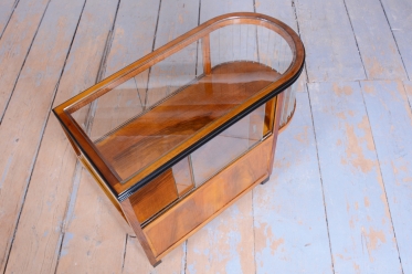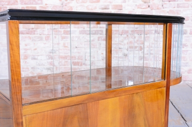 The structure of the cart is crafted from walnut-veneered blockboard, whose rich wood grain has been meticulously restored and lacquered to a high gloss, highlighting its sophistication. The cart boasts a rounded upper section with ground clear glass, which displays the contents while protecting them.