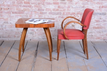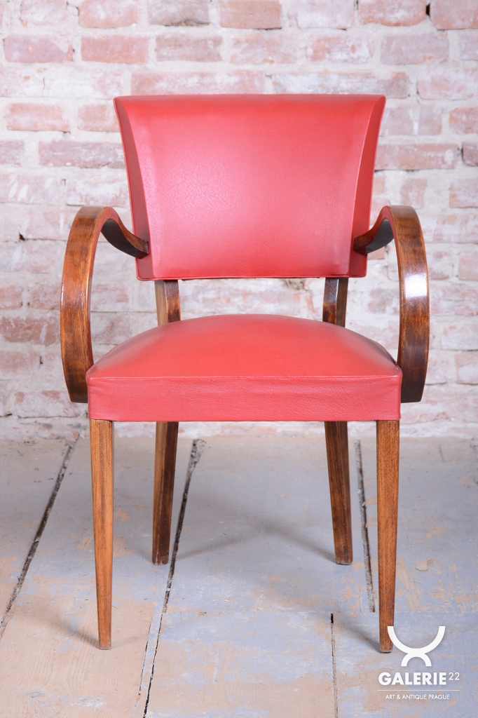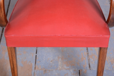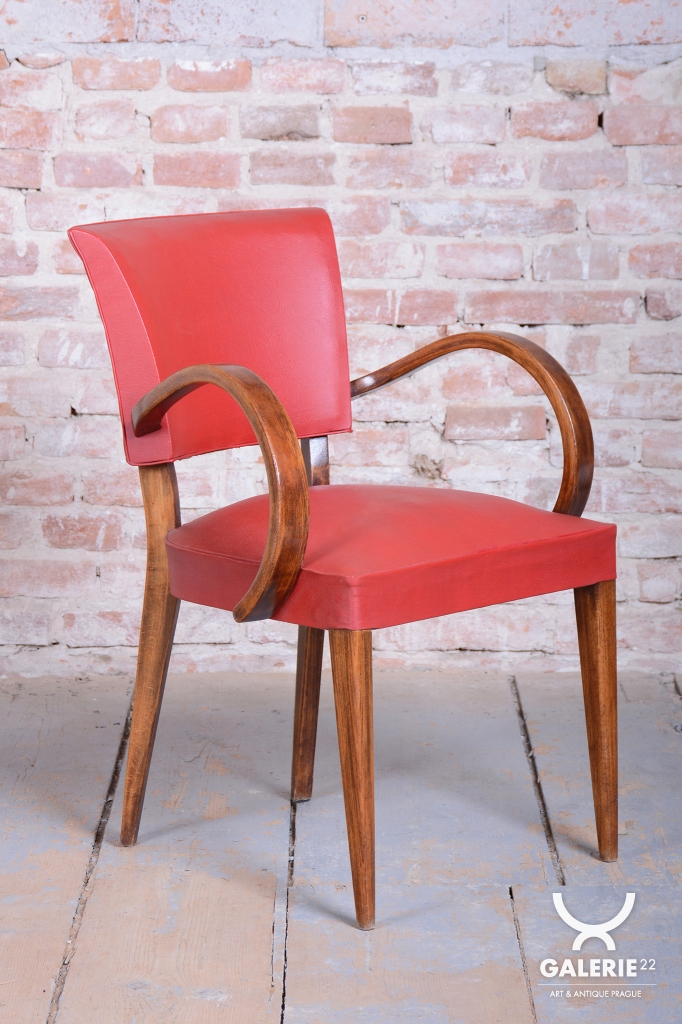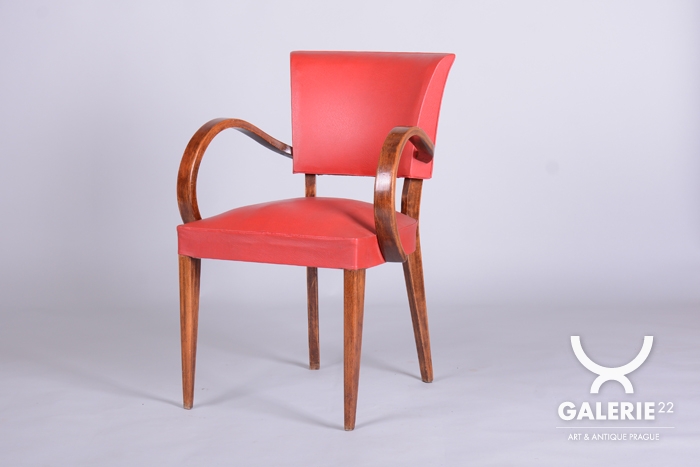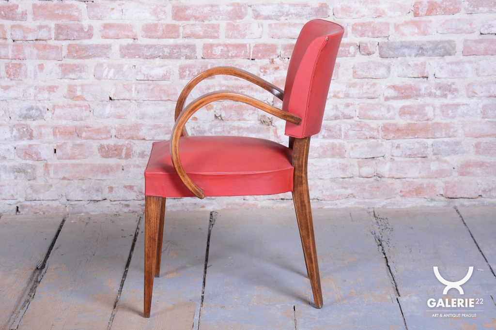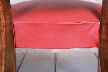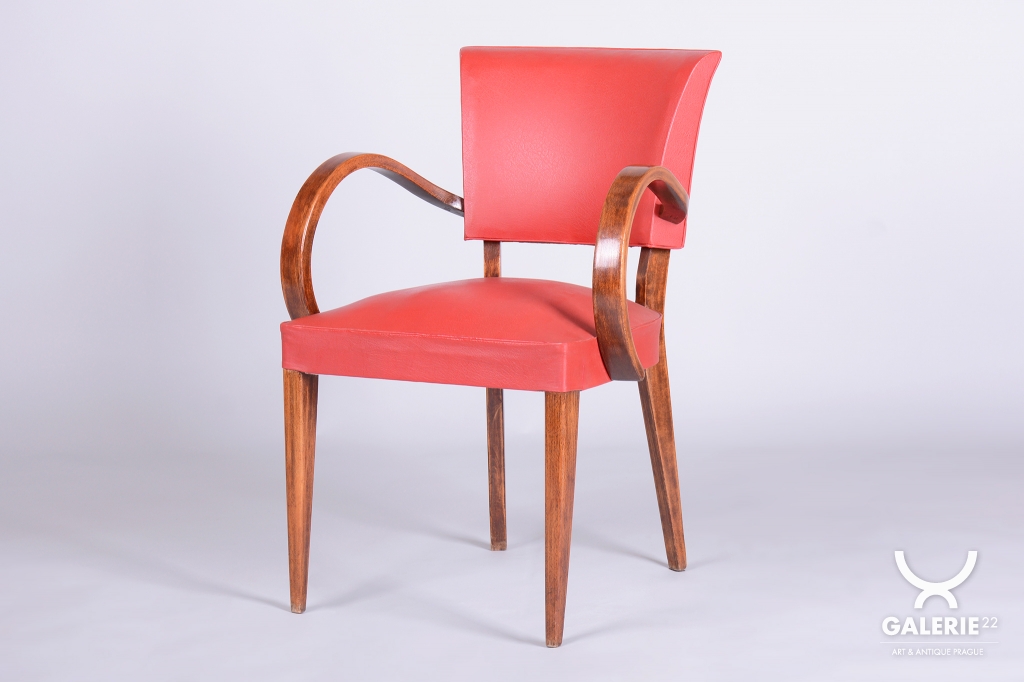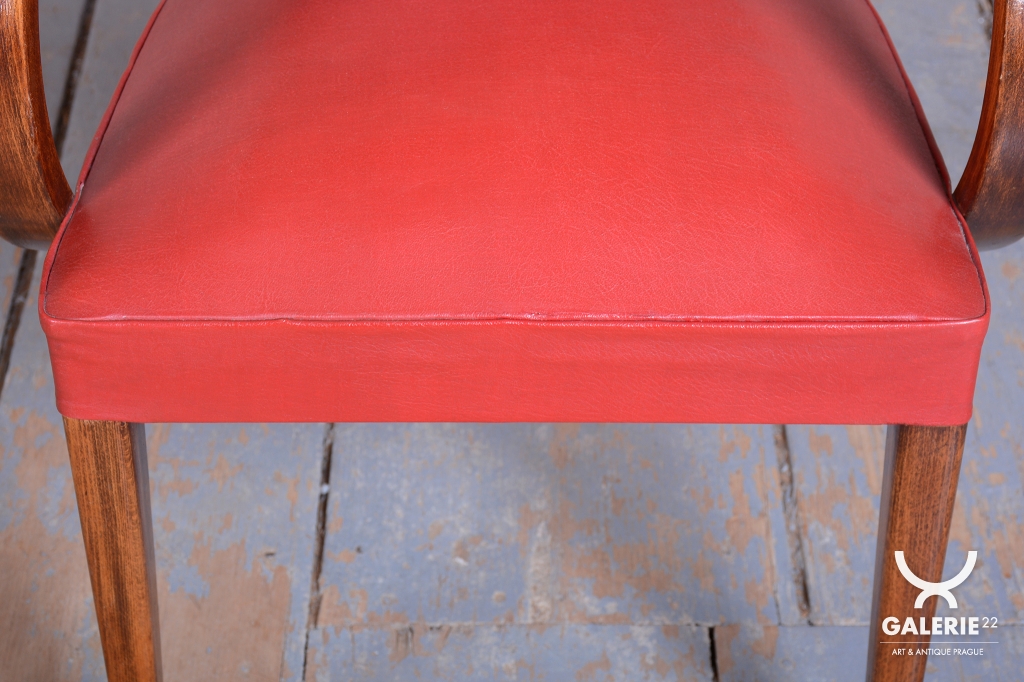 The armchairs frame is crafted from solid beech wood with a beautiful, warm tone. The chair has undergone restoration and features a revived polish, which highlights the authenticity and beauty of the wood. It is fitted with traditional upholstery in faux leather, which is very well-preserved and not sagged, ensuring maximum comfort.