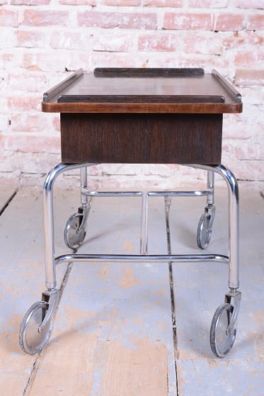 The carts frame is crafted from tubular chrome-plated steel, which has been professionally cleaned to restore its original mirror-like luster. The top surface is made of oak-veneered blockboard, and the wood polish has been revived, emphasizing the natural beauty of the material.