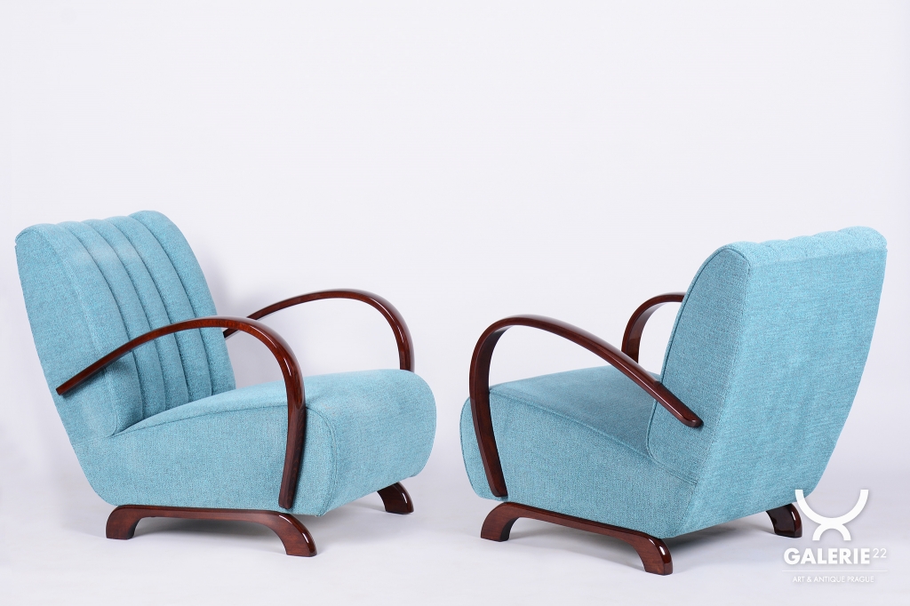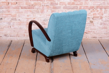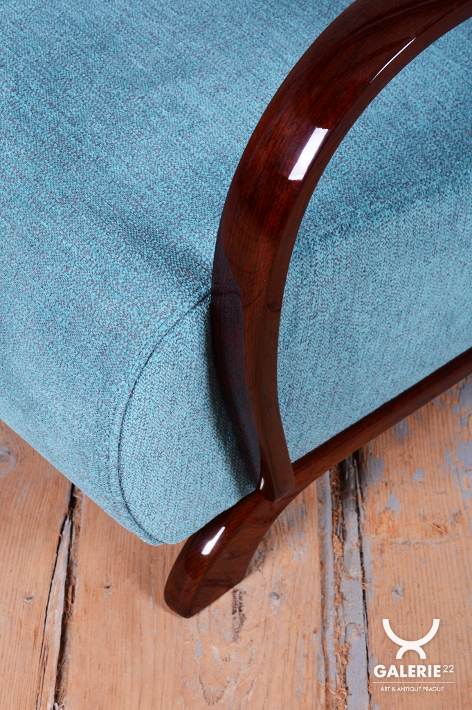 This exceptional armchair is an iconic representative of the Art Deco style, manufactured in Czechoslovakia during the 1930s. It is a famous design by architect Jindřich Halabala for the renowned UP Závody, ranking among the most sought-after pieces of Central European modernism. The frame, crafted from solid beech, is finished with elegant walnut veneer, whose striking grain gives the chair its unmistakable character.