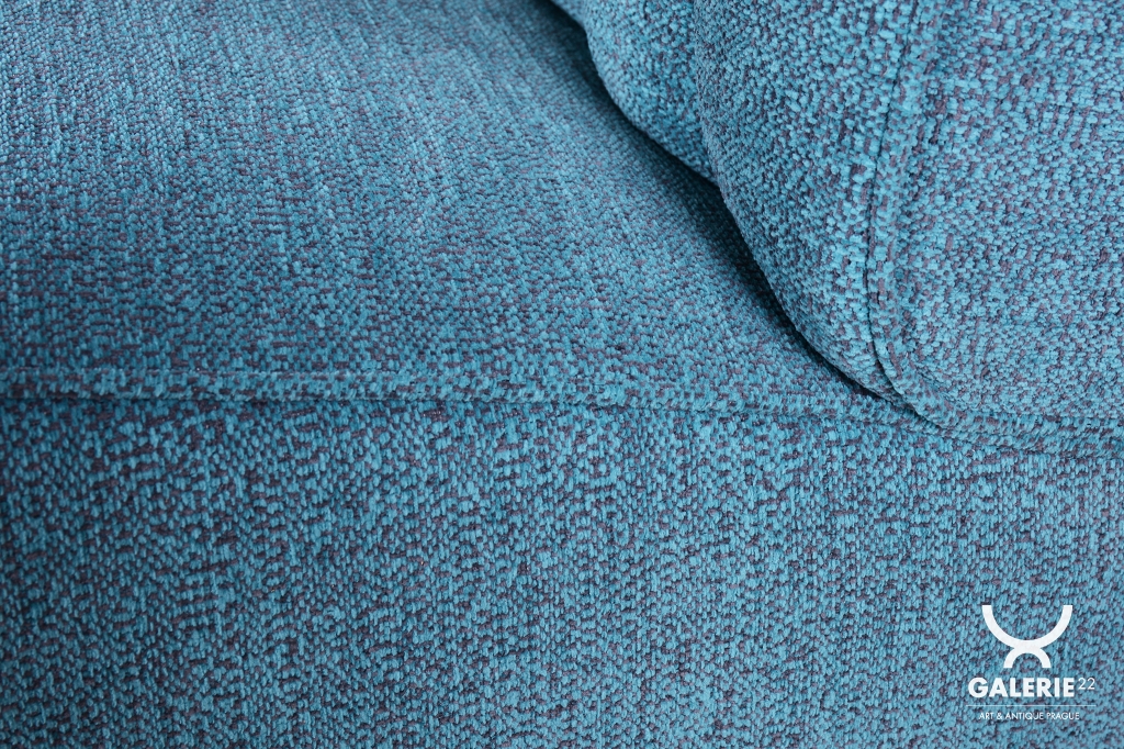 Beyond its aesthetic appeal, the armchair has been fully restored functionally with new professional spring upholstery. This was crafted using traditional methods to ensure maximum seating comfort while maintaining its authentic silhouette. The new upholstery fabric in a teal shade with a subtle texture harmoniously complements the dark tones of the walnut wood, emphasizing the overall luxurious feel of the piece.