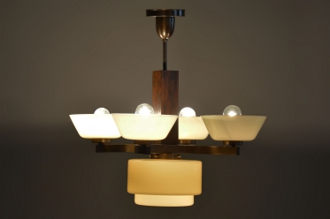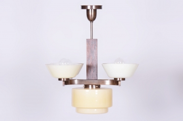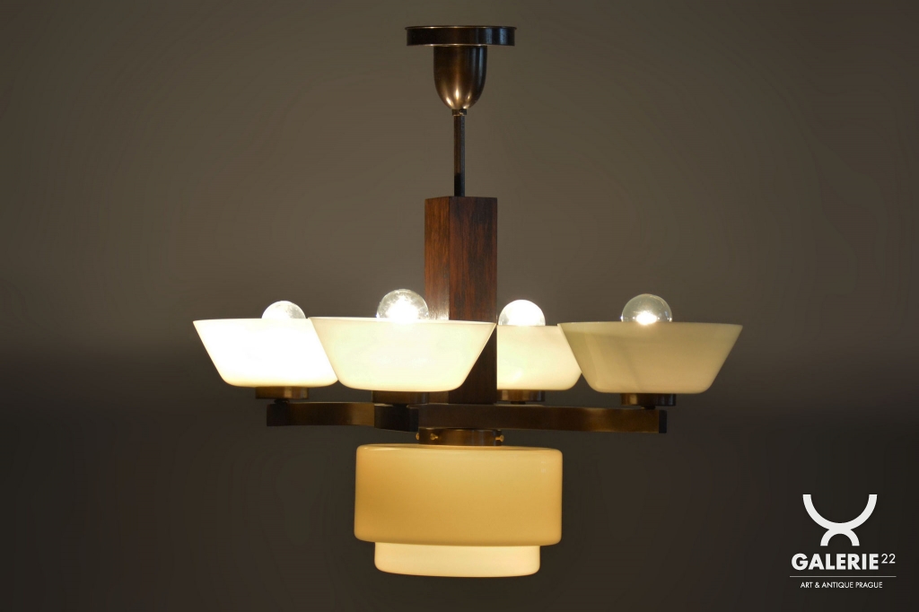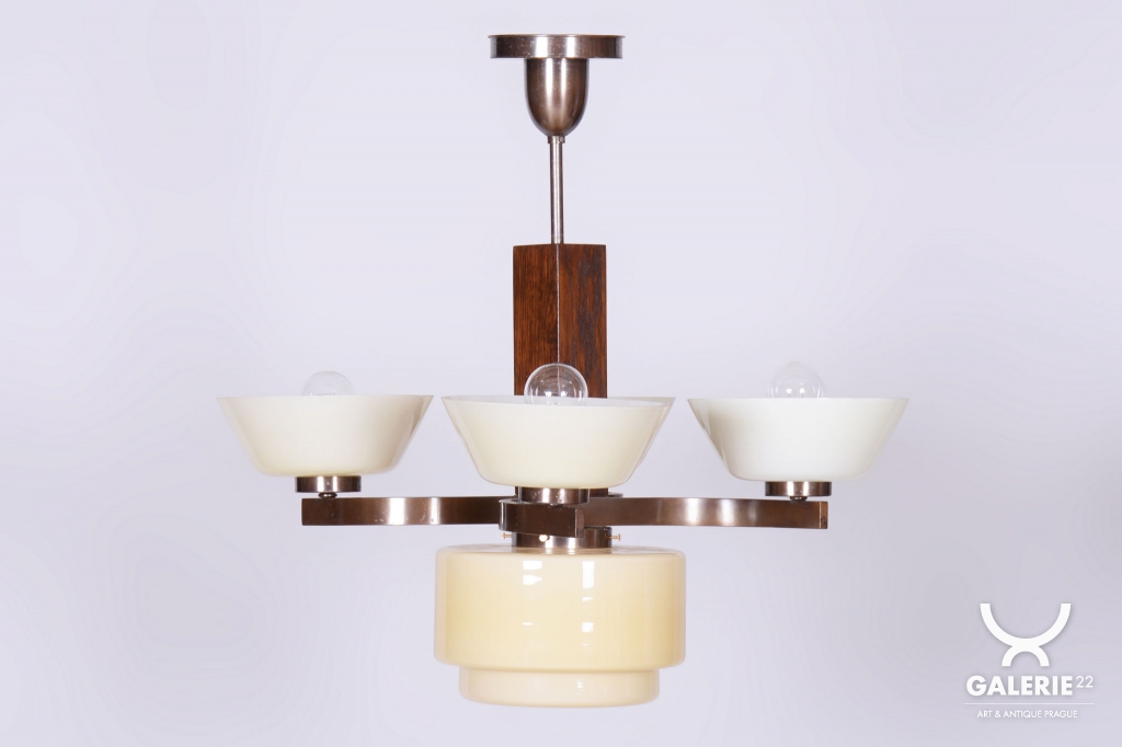 This 4-arm chandelier is a masterpiece of 1920s Czechoslovak Art Deco. The lighting fixture presents a fascinating combination of geometric austerity and luxurious material design, typical of high-end interwar interiors. The dominant feature is the central wooden element made of solid oak, featuring a revived original polish that highlights the deep texture of the wood.