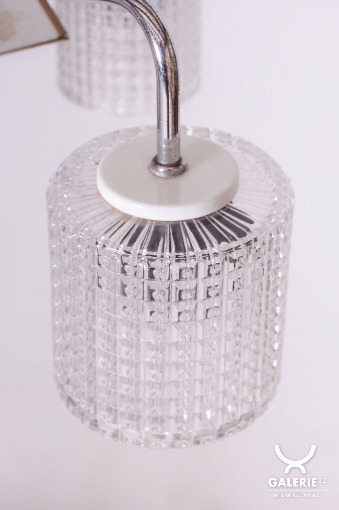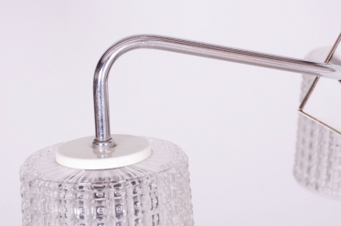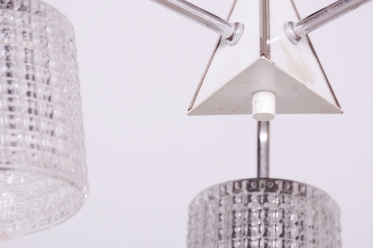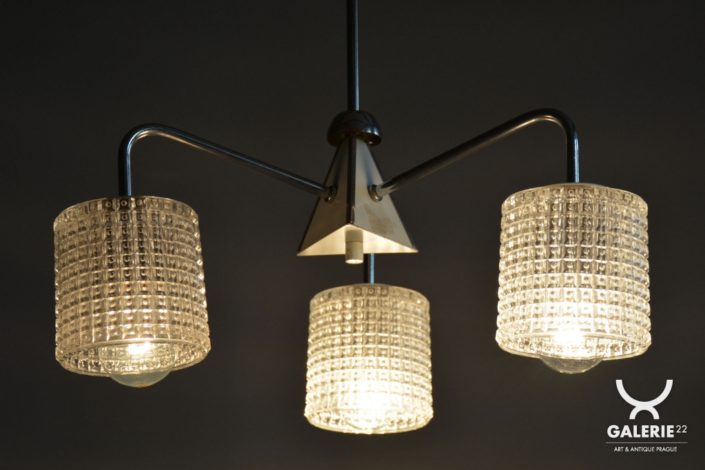 This three-arm chandelier, produced by the Drukov company in Brno, is a striking representative of Czechoslovak design from the 1970s. The fixture combines the geometric austerity of the late Mid-Century style with industrial elements typical of that period and manufacturer. The elegant construction relies on a harmonious contrast between professionally cleaned chrome-plated steel and black lacquered metal details, giving the chandelier a modern and timeless look.