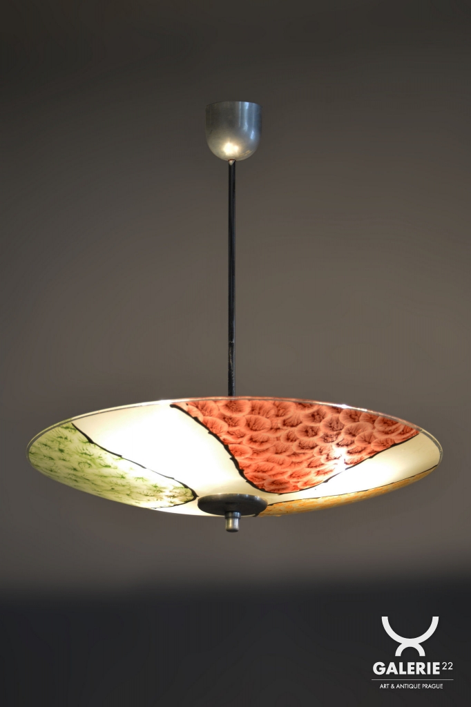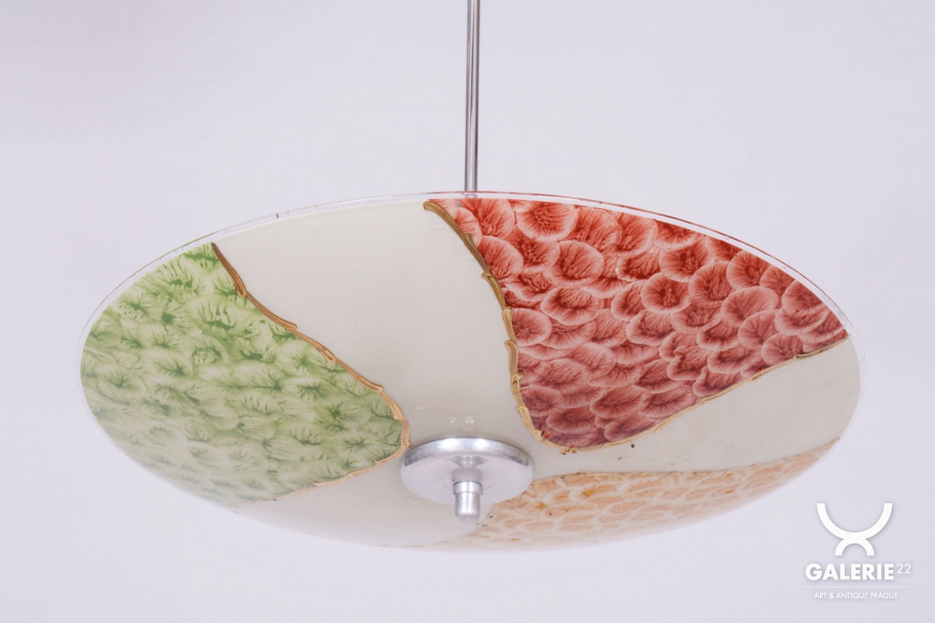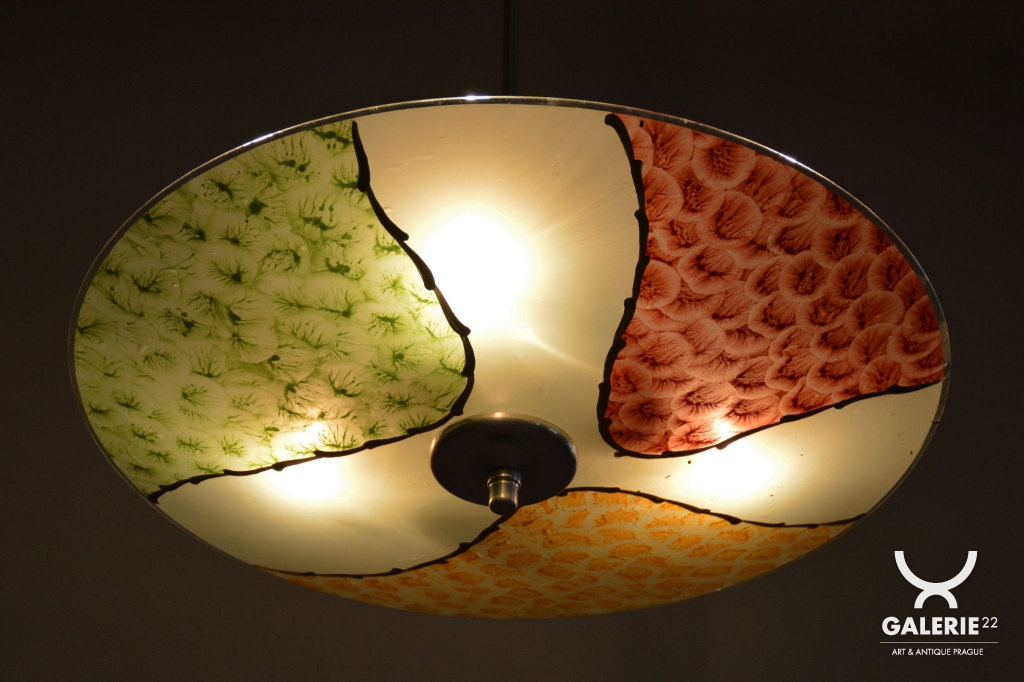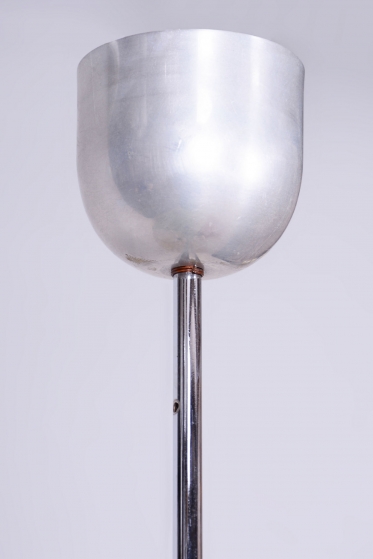 The structural heart of the chandelier is a chrome-plated steel stem, which has been professionally cleaned to a high mirror finish during restoration. The chrome details, including the central mount and decorative bottom cap, create a modern and timeless contrast with the delicate glass. Beneath the shade lies a three-arm carrier fitted with three E27 sockets, ensuring a high light output suitable even for larger rooms.