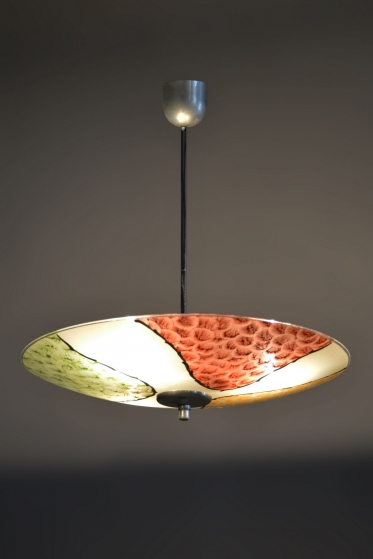 This three-bulb chandelier is an elegant representative of mid-20th-century design, fully embodying the Mid-Century Modern aesthetic. The fixture stands out for its balanced form and clarity, dominated by a large, shallow disc-shaped glass shade. The milky glass with a subtle cream tint ensures perfectly soft and even light diffusion, creating a very pleasant and cozy atmosphere in any interior.