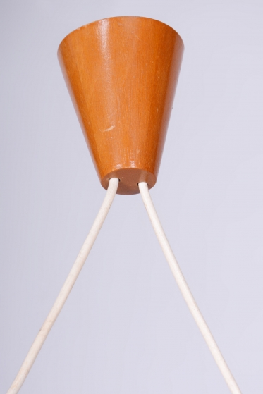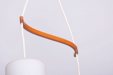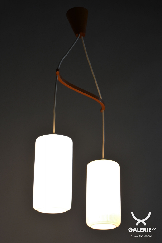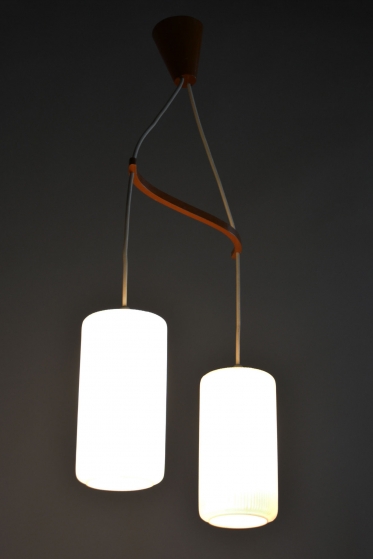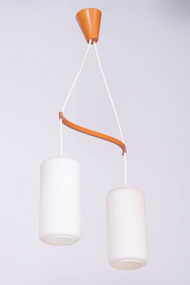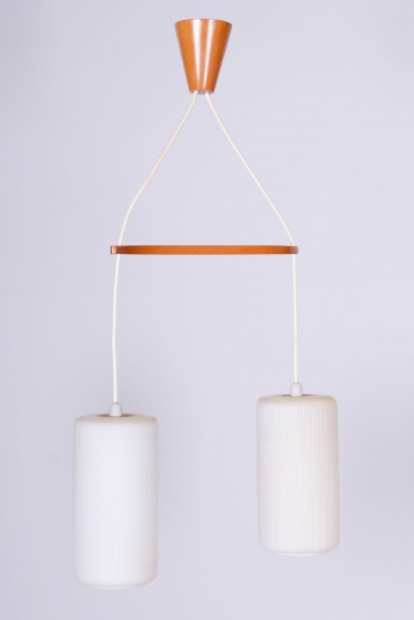 The chandelier is fitted with two glass shades with a diameter of 14 cm, made of white opal glass. Their shape ensures pleasantly diffused, soft light that prevents glare. The contrast between the warm wood and the milky glass gives the fixture a timeless look that fits perfectly into both retro and contemporary interiors.