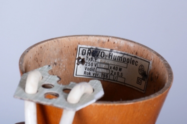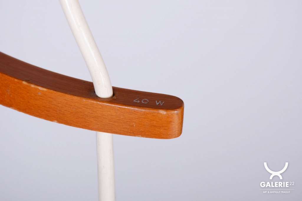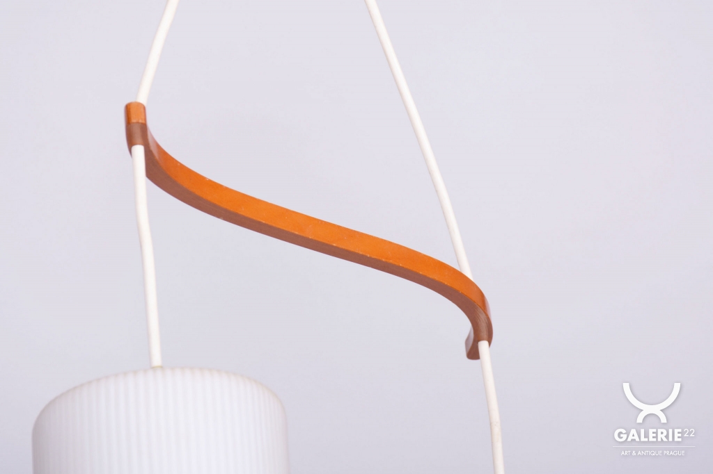 This two-arm chandelier, produced by the Dřevo Humpolec factory, is an iconic representative of Czechoslovak design from the mid-20th century. The fixture embodies the Mid-Century Modern aesthetic, which focuses on the combination of natural materials and organic shapes. The beech wood has been professionally restored to highlight its natural color and delicate grain.