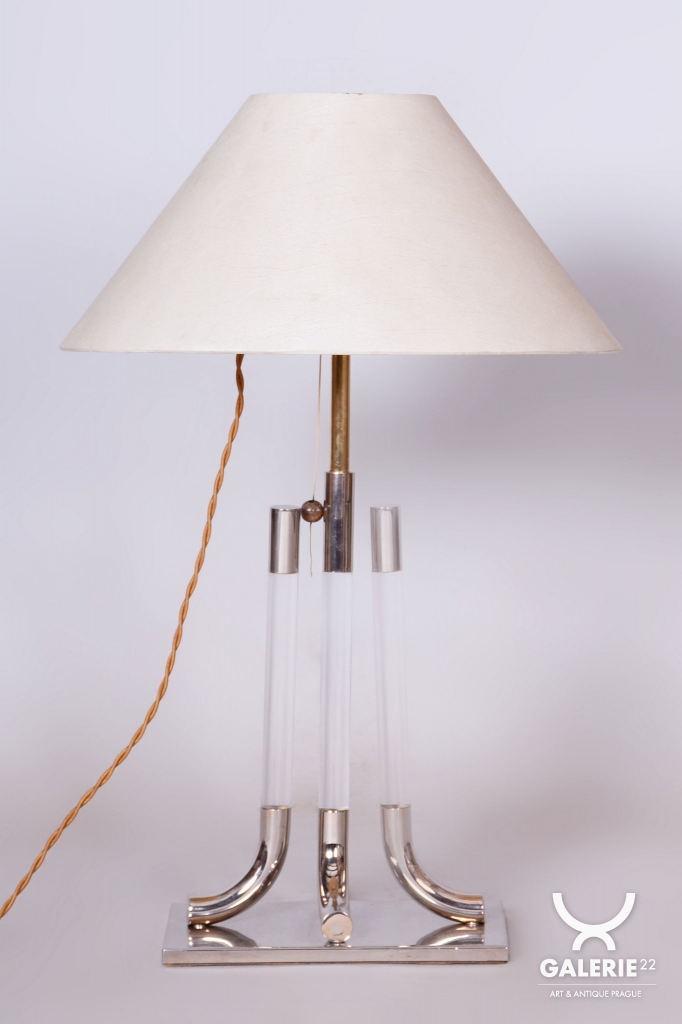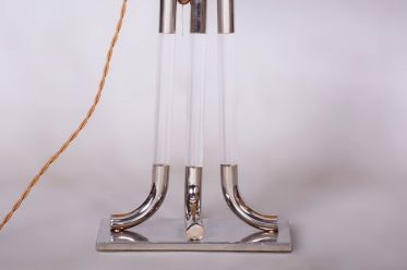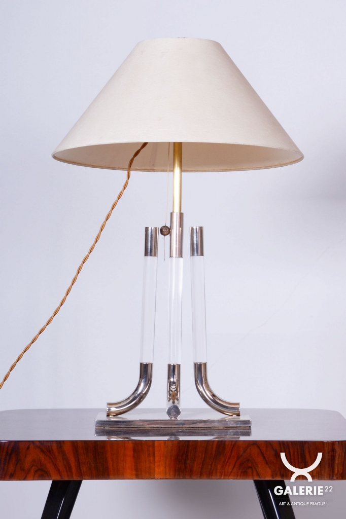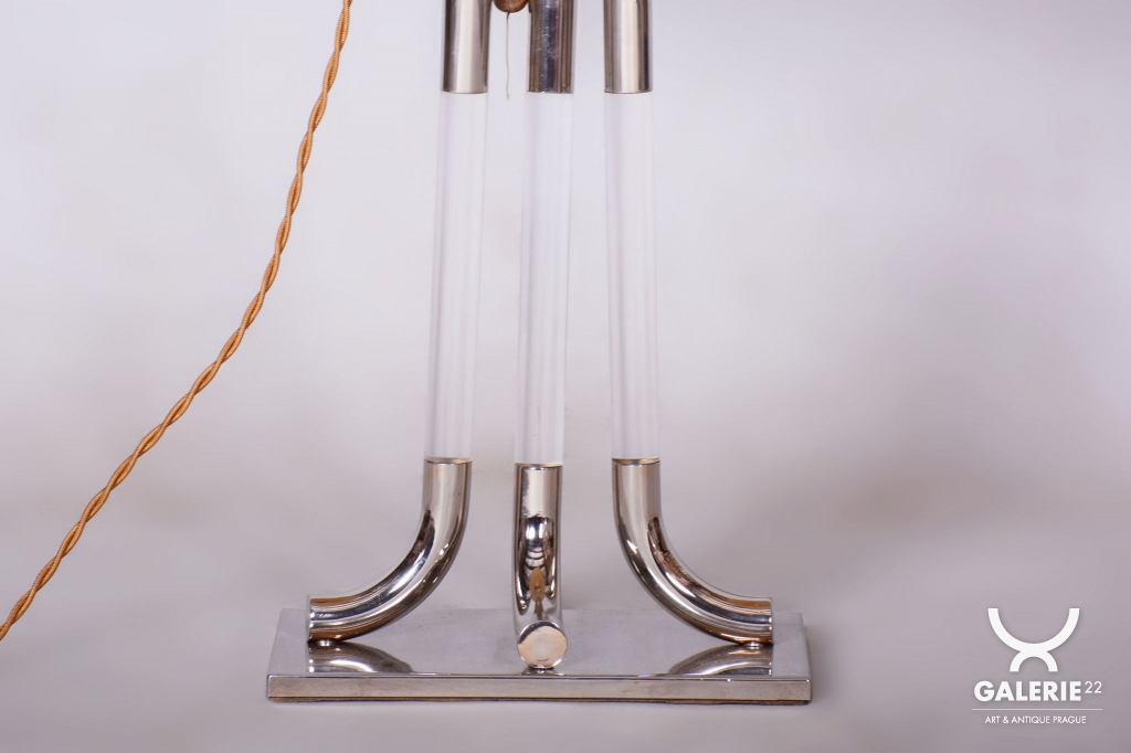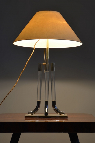 This table lamp is a prime example of 1970s Italian design, embodying the luxurious and bold aesthetic of the late Mid-Century style. The lamp captivates with its monumentality and a refined combination of materials typical of Italian production from this era. The dominant feature of the base is a central glass cylinder set into elements made of professionally cleaned chrome-plated steel, whose high mirror finish lends the object a modern and exclusive character.