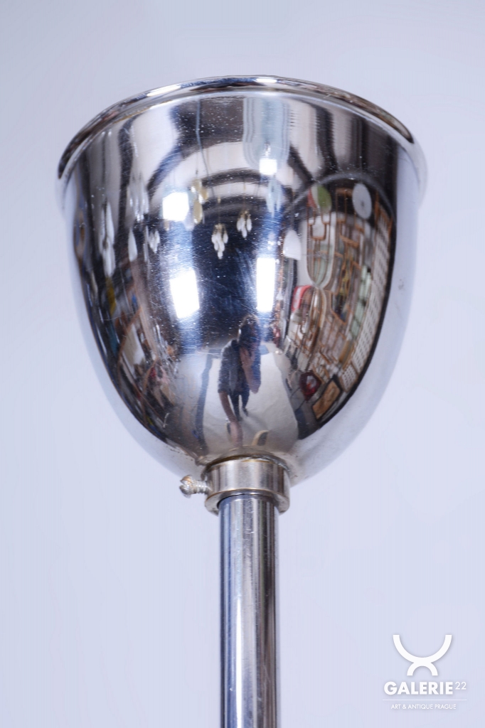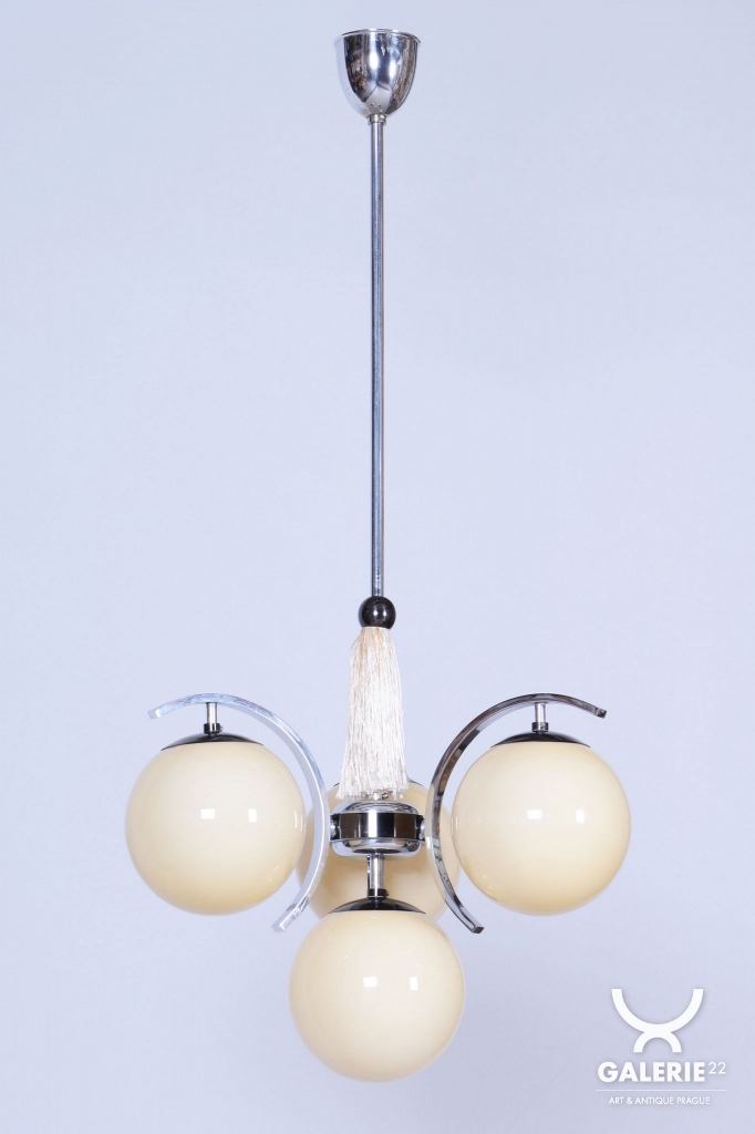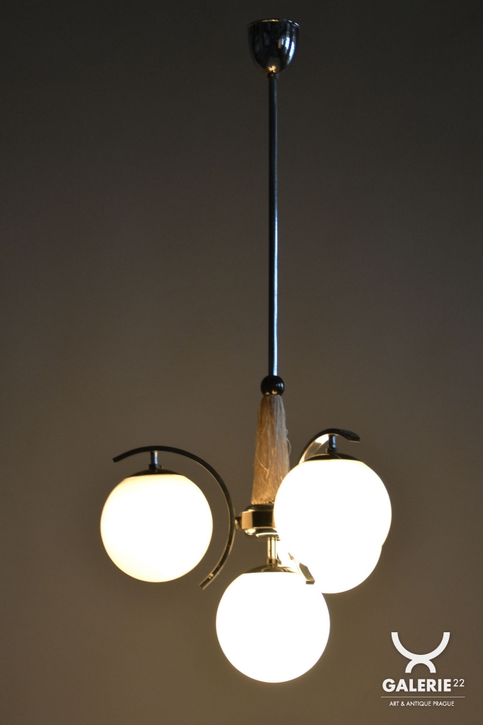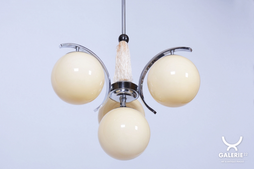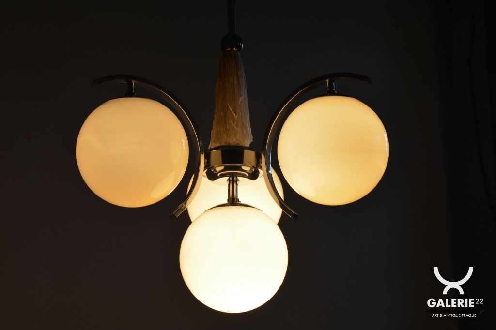 This four-light chandelier is an exclusive example of early 20th-century Czechoslovak design, harmoniously blending the decorative elegance of Art Deco with the functional austerity of the emerging Bauhaus style. The fixture captivates with its dynamic and unconventional composition: three horizontal arms extend from the central axis, while a fourth shade is uniquely positioned at the bottom of the central body.