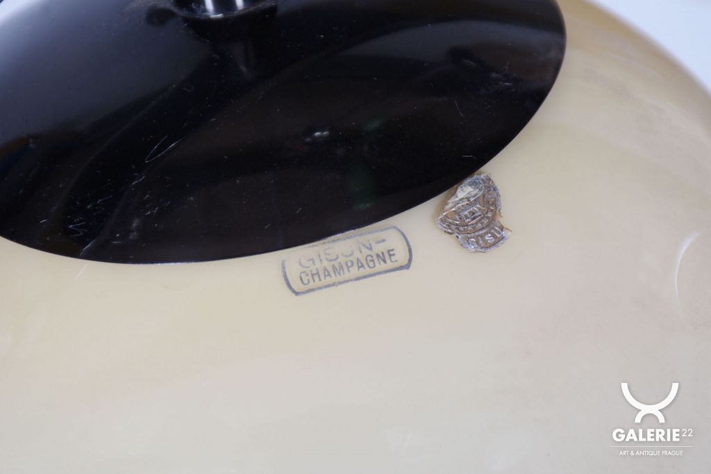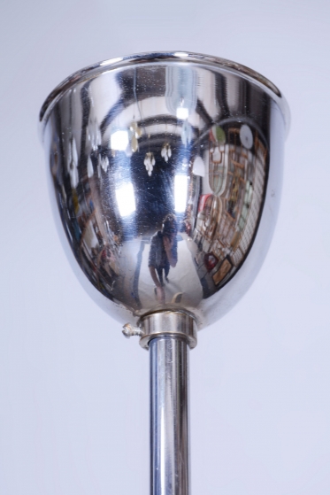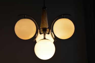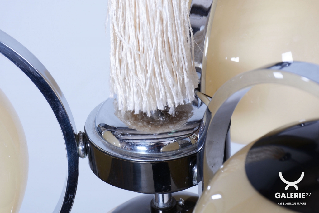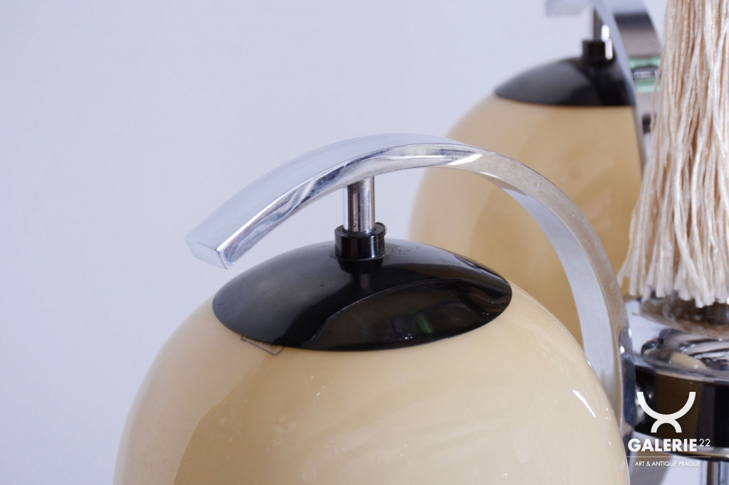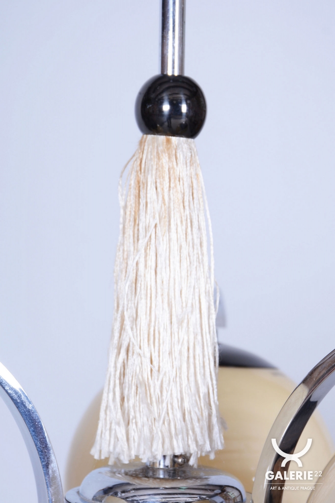 This four-light chandelier is an exclusive example of early 20th-century Czechoslovak design, harmoniously blending the decorative elegance of Art Deco with the functional austerity of the emerging Bauhaus style. The fixture captivates with its dynamic and unconventional composition: three horizontal arms extend from the central axis, while a fourth shade is uniquely positioned at the bottom of the central body.