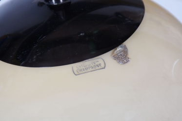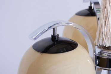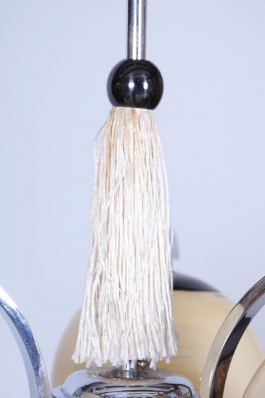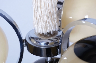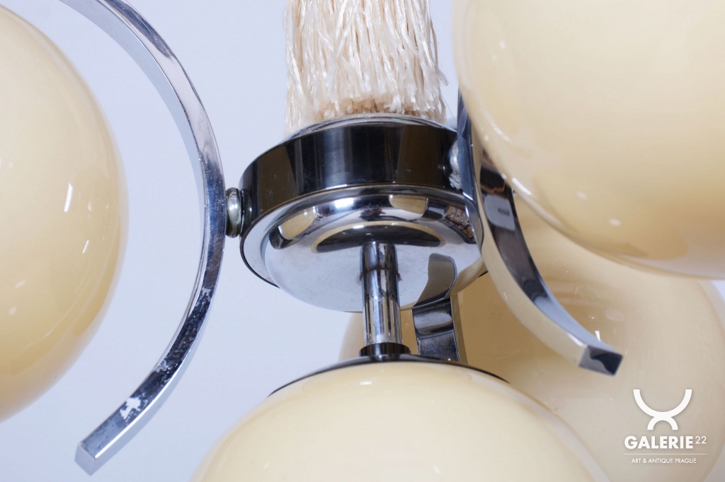 The chandelier's structure is made of chrome-plated steel, which has been professionally cleaned to a mirror finish. The polished surface provides a luxurious contrast to the four beige opal glass shades. The spherical forms ensure perfect, soft light diffusion in all directions.