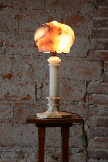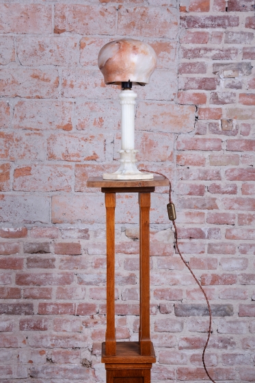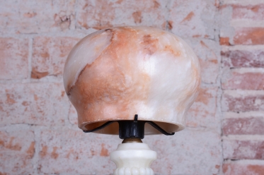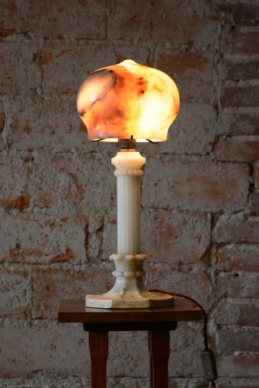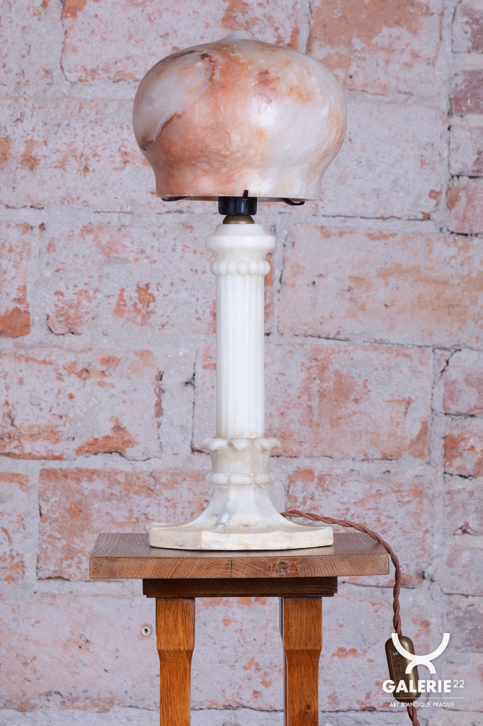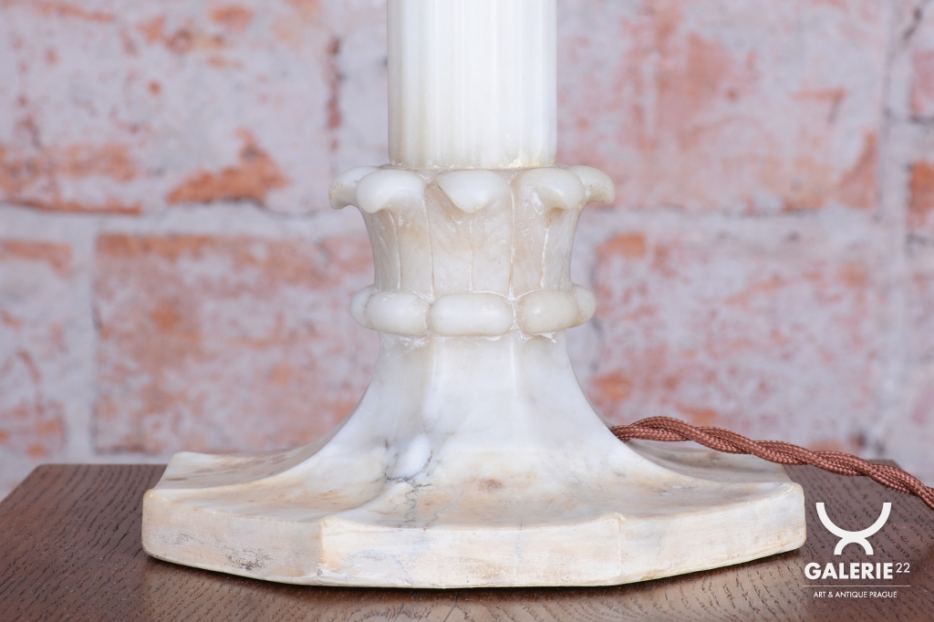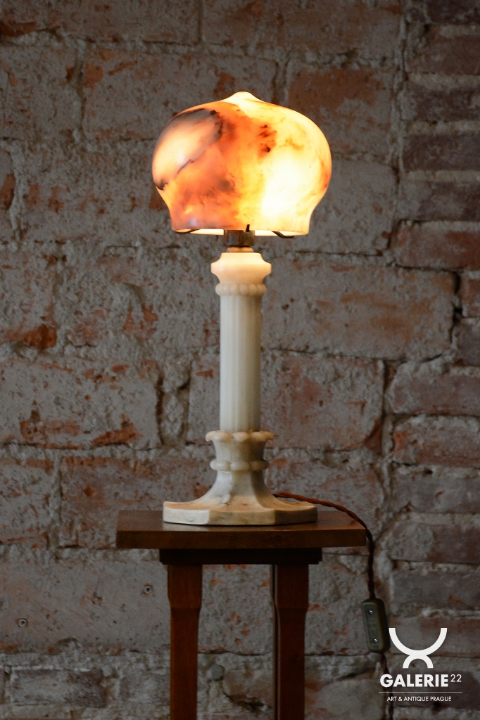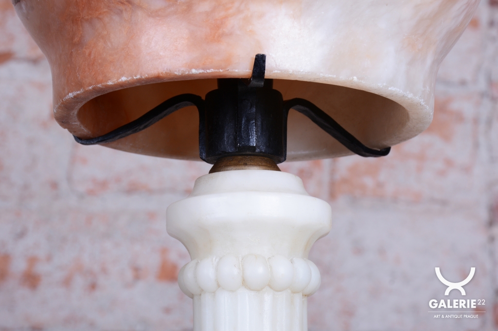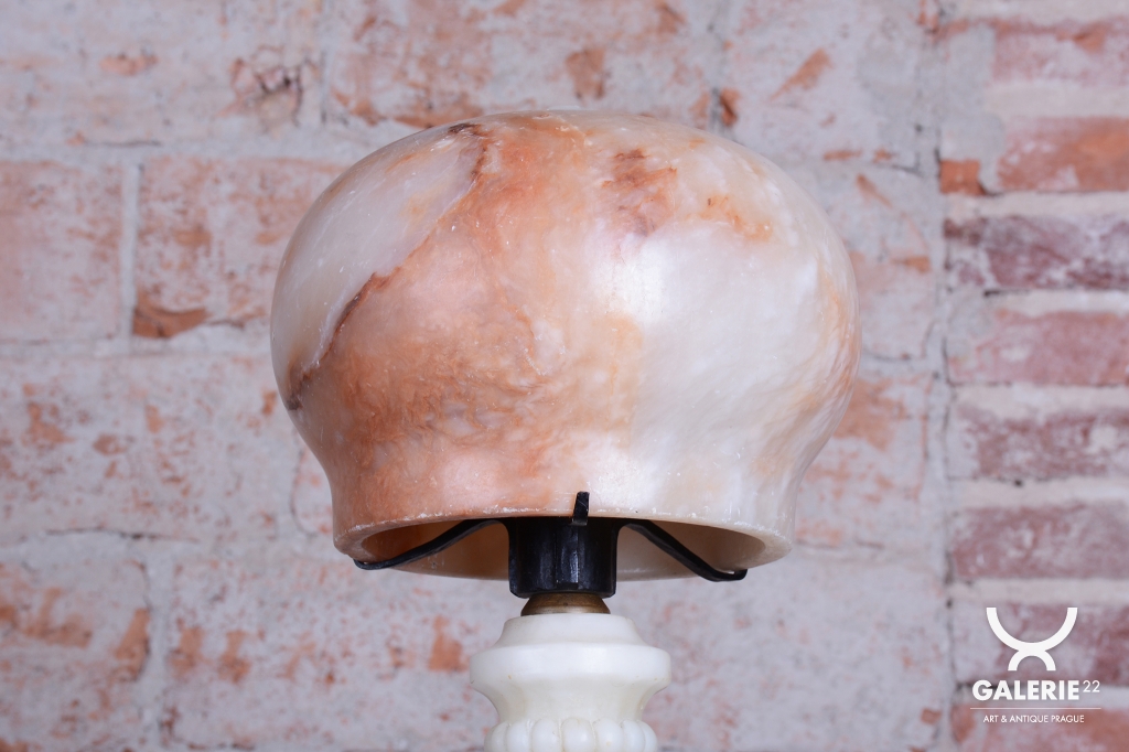 Předmět se nachází v původním, velmi zachovalém stavu. Robustní mramorová konstrukce základny poskytuje stabilitu a tvoří pevný podklad pro jemné stínidlo z alabastru. Právě alabastr je ceněn pro svou specifickou strukturu a schopnost propouštět světlo v neopakovatelných nuancích. Svítidlo prošlo technickou revizí a má novou elektrifikaci, je tedy plně funkční a připraveno k okamžitému užívání v moderním i historickém kontextu.
