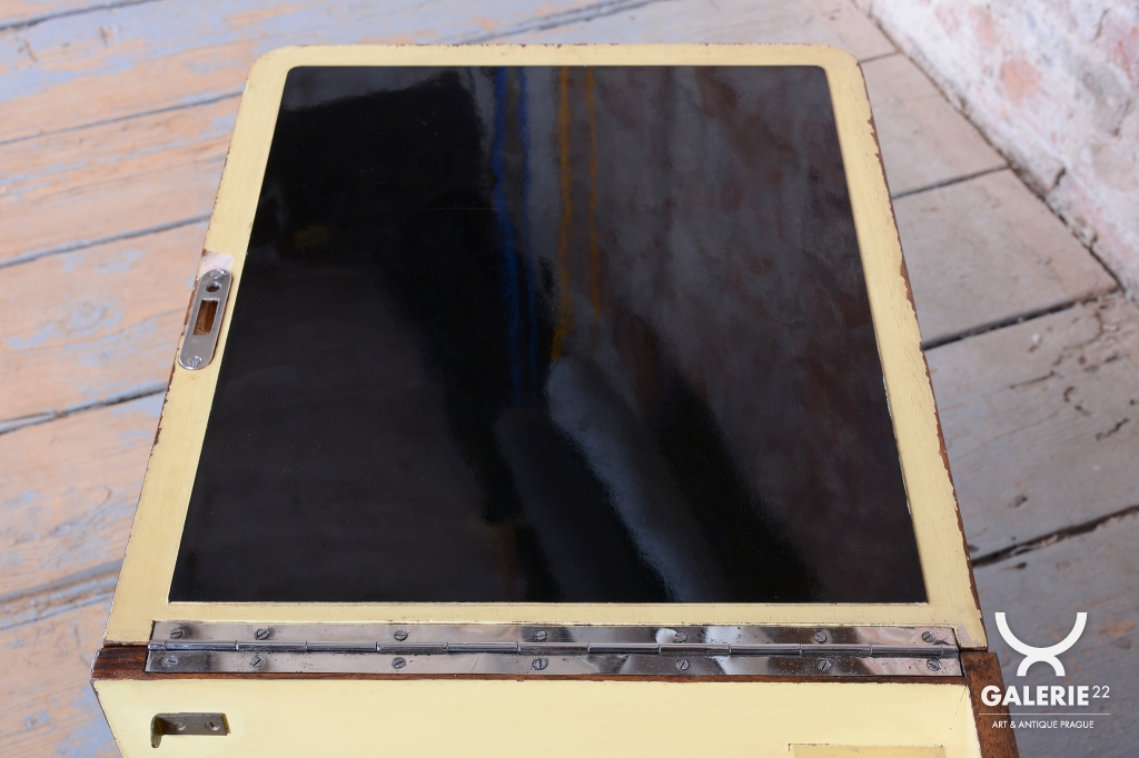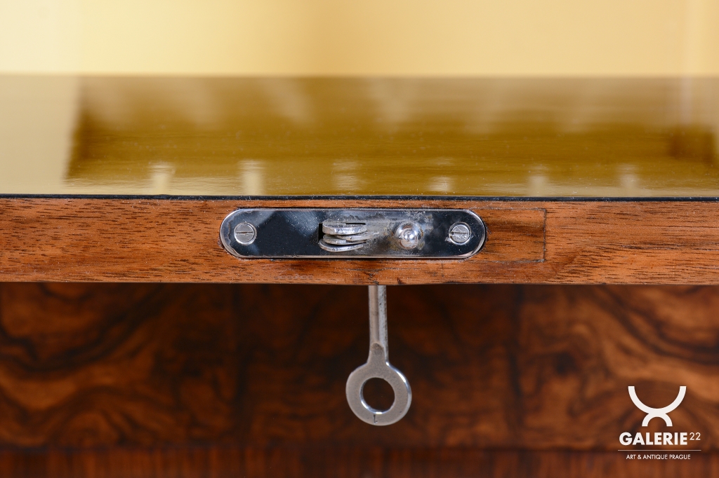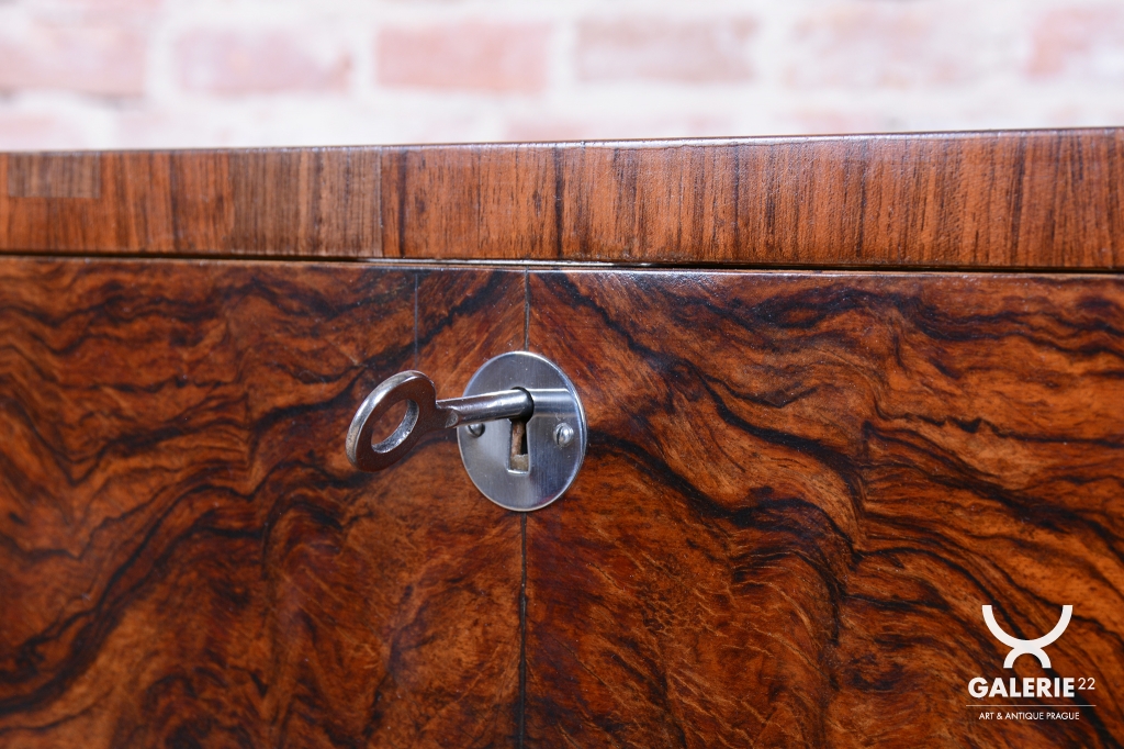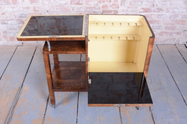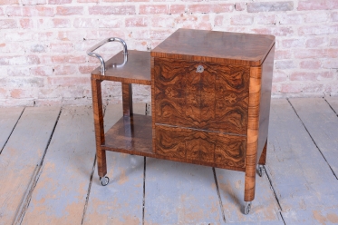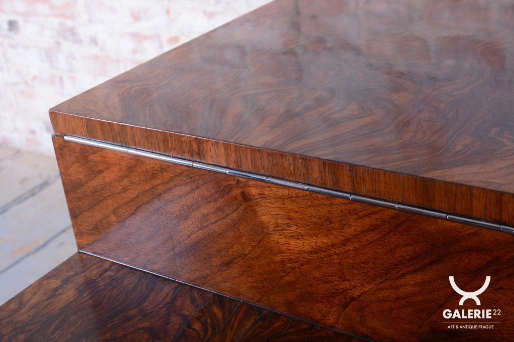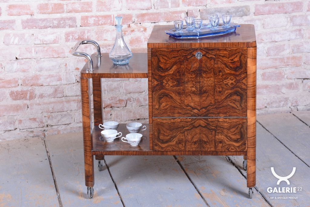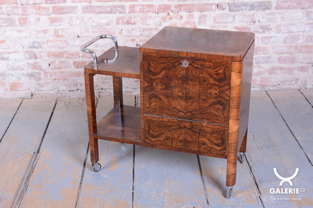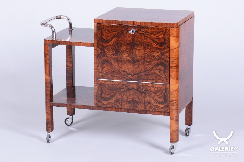 Tento luxusní servírovací stolek ve stylu Art Deco pochází z Československa z 20. let 20. století. Jedná se o mistrovské dílo, které kombinuje ušlechtilé materiály s funkcionalistickou praktičností.
