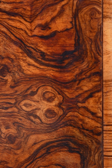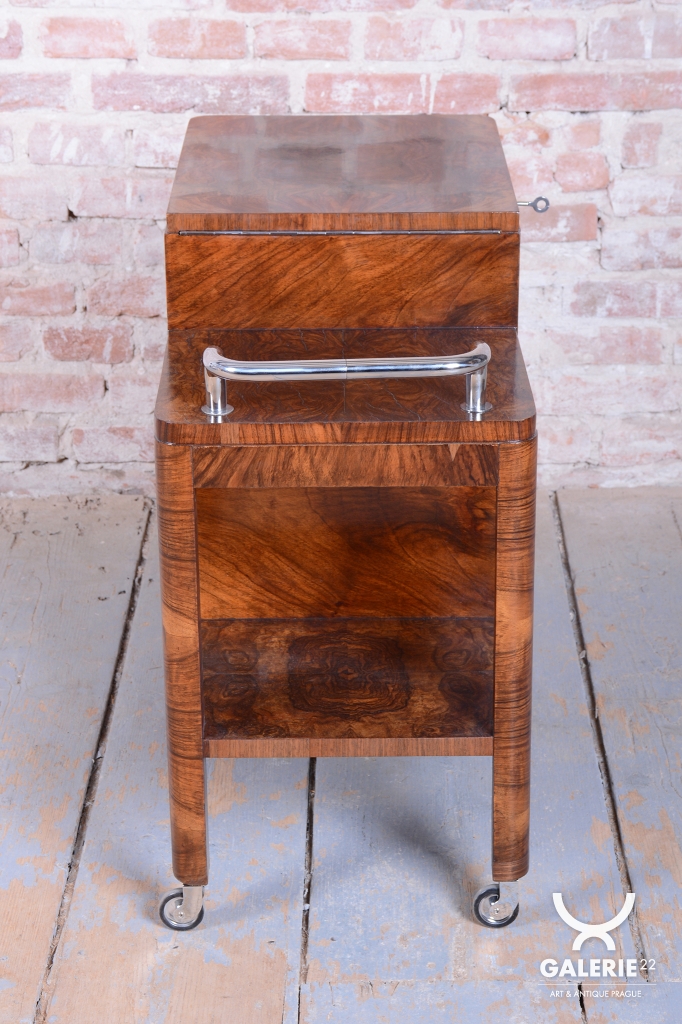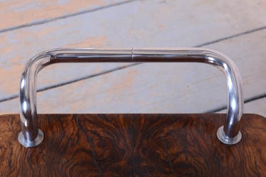 Stolek je zhotoven z bukové laťovky dýhované vzácnou ořechovou kořenicí, která se pyšní mimořádně bohatou a dekorativní kresbou dřeva. Korpus prošel pečlivou renovací a má oživenou původní polituru, podtrhující hloubku a lesk dýhy. Konstrukce je vybavena madlem z chromované trubkové oceli a otočnými kolečky, díky čemuž je zcela funkční a snadno pojízdný. Chrom byl profesionálně vyčištěn.