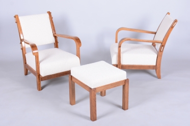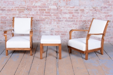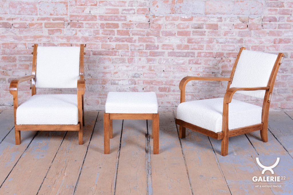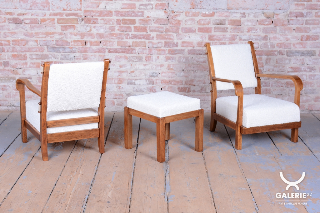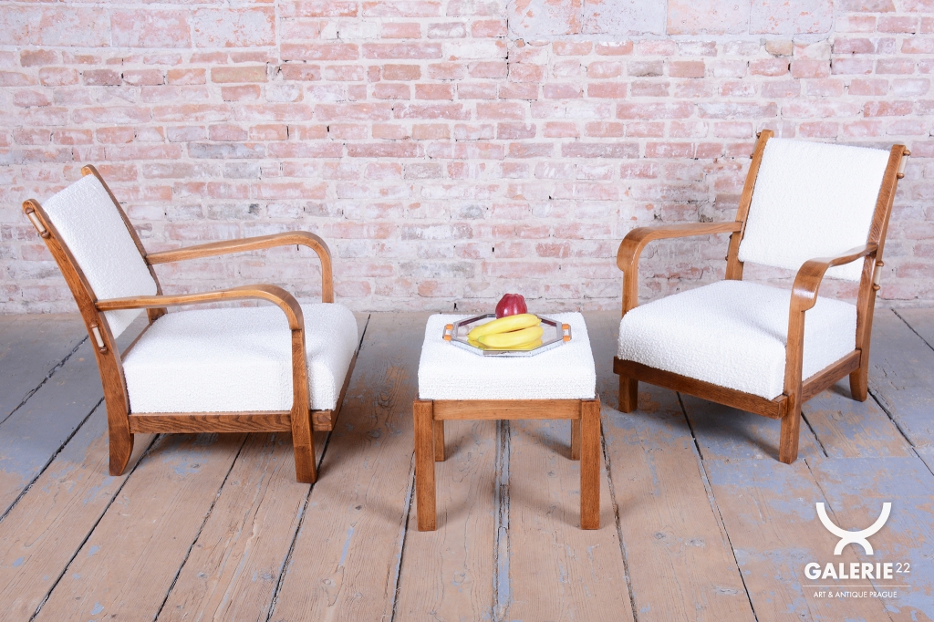Tento set páru křesel a taburetu je vynikajícím příkladem československého Art Deca ze 30. let 20. století. Souprava byla vyrobena proslulou Krásnou jizbou, která byla v meziválečném období synonymem pro vkusné bydlení a vysokou kvalitu řemeslného zpracování. Krásná jizba sdružovala nejvýznamnější umělce a designéry své doby a tento set dokonale odráží jejich snahu o spojení moderního stylu s maximálním uživatelským komfortem.