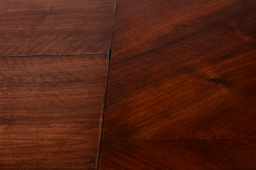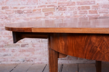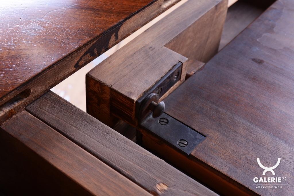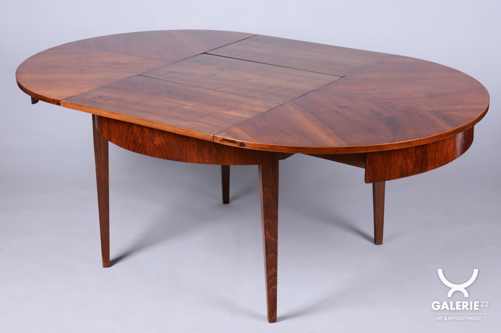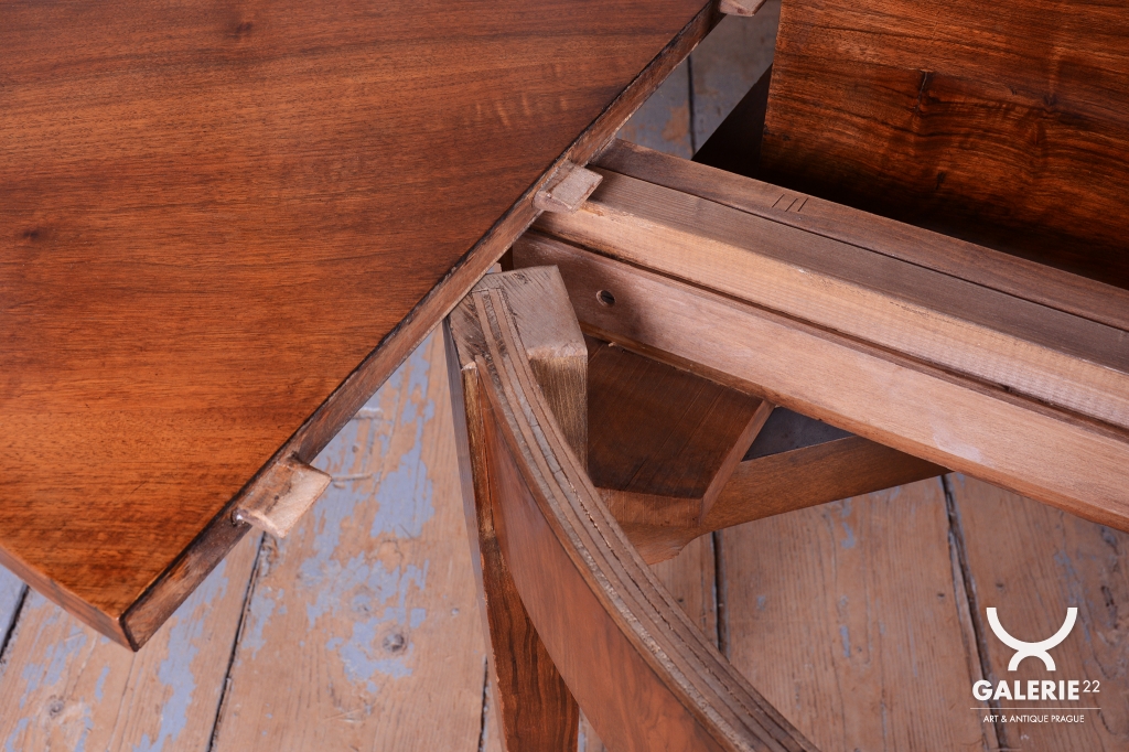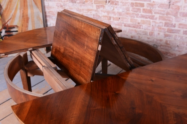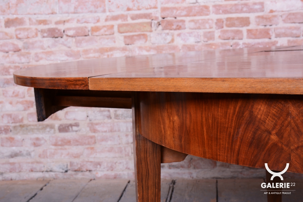 Základem stolu je poctivá laťovka dýhovaná ořechem s nádhernou kresbou dřeva. Vnitřní konstrukce pod dýhou je vyrobena z kombinace masivního ořechu, buku a smrku, což zajišťuje mimořádnou odolnost. Stůl prošel procesem restaurování, v rámci kterého byla konstrukce zpevněna pro maximální stabilitu a byla citlivě oživena původní politura, která dřevu navrátila jeho hloubku a lesk. Kus je plně funkční a připraven stát se dominantou stylové jídelny.