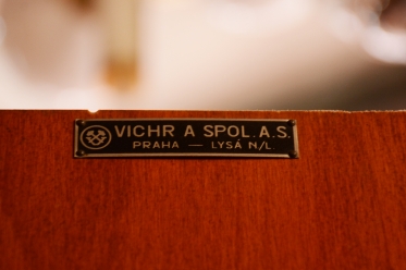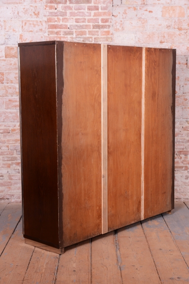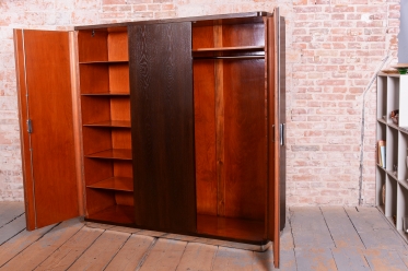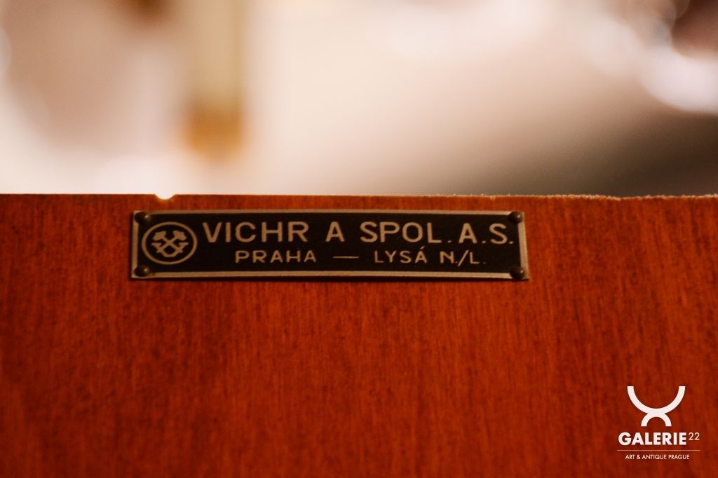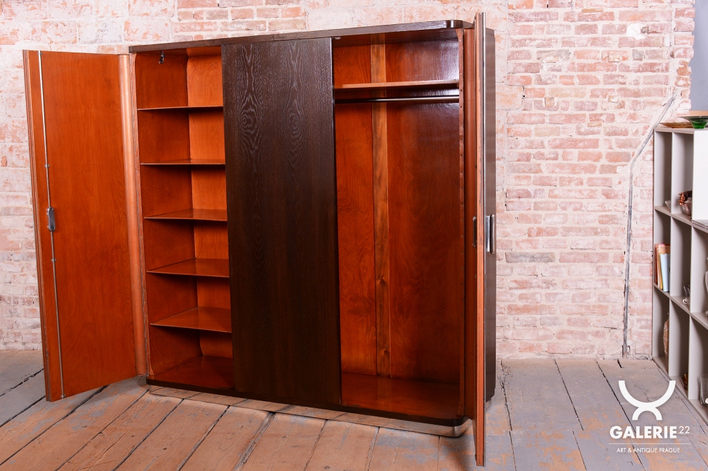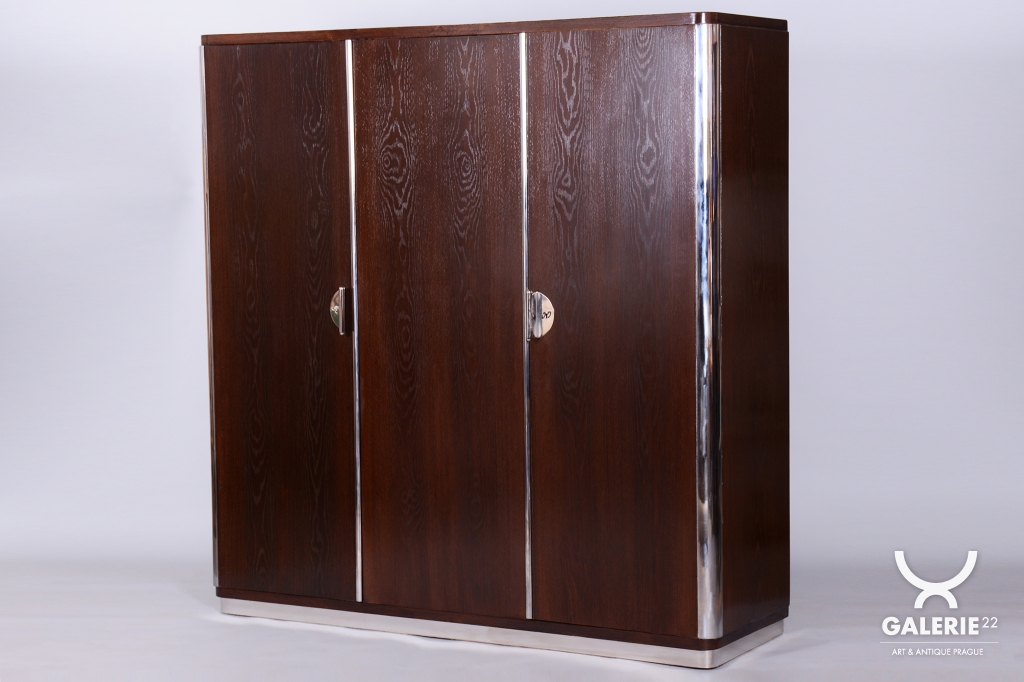 Tato elegantní třídveřová skříň je reprezentativním dílem proslulého výrobce Vichr a spol. z Lysé nad Labem a pochází z Československa 40. let 20. století. Konstrukce je vyrobena z kvalitní laťovky dýhované dubem, jejíž původní politura byla v rámci celkového restaurování citlivě oživena do původní krásy.