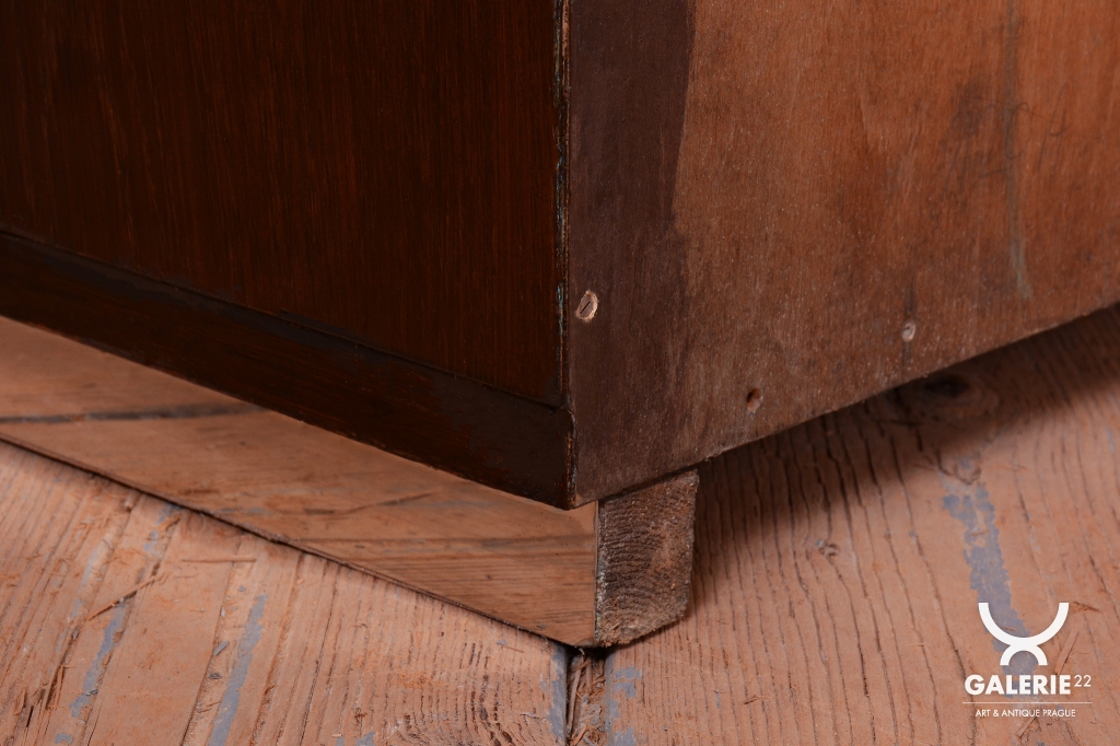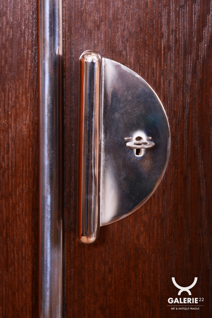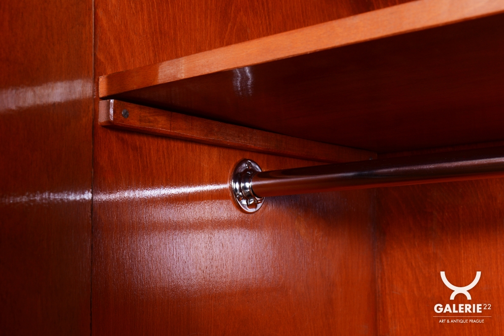 Výrazným estetickým i funkčním prvkem jsou kovové chromované doplňky a lemování, které byly profesionálně vyčištěny do vysokého lesku. Skříň se vyznačuje mimořádně stabilní konstrukcí a je plně funkční pro každodenní užívání. Velkou praktickou výhodou tohoto kusu je jeho rozkládací systém, který umožňuje snadnou přepravu a bezproblémové stěhování i do hůře přístupných prostor.