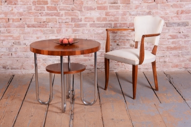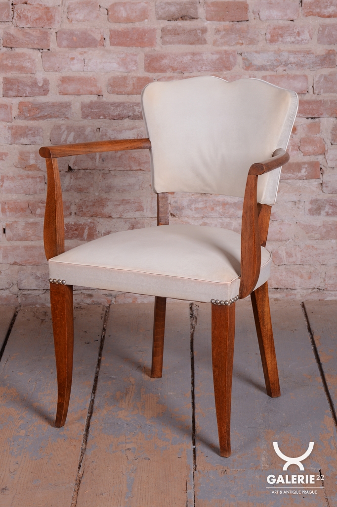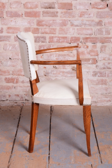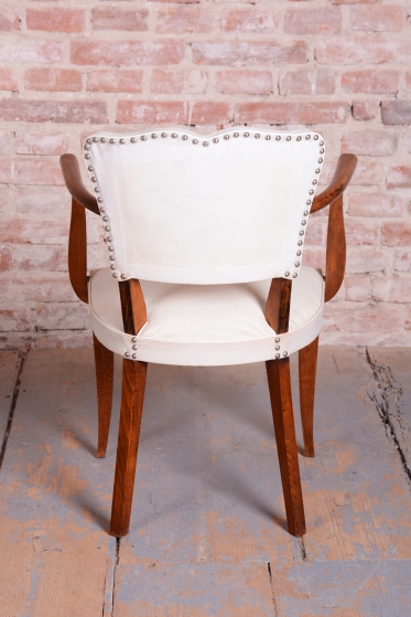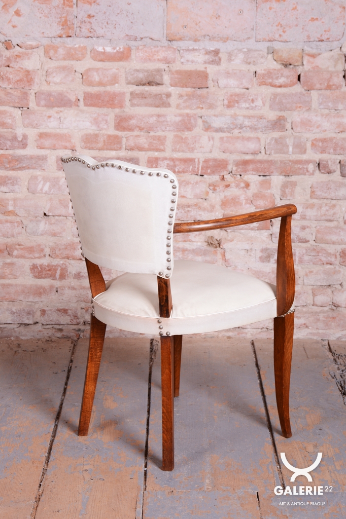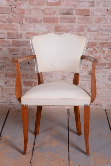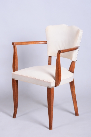 Toto elegantní křeslo ve stylu Art Deco pochází z Francie z 30. let 20. století a je připisováno vlivnému designérovi Julesi Leleuovi. Ztělesňuje francouzskou noblesu a šarm meziválečného období.