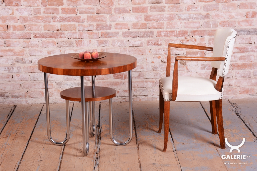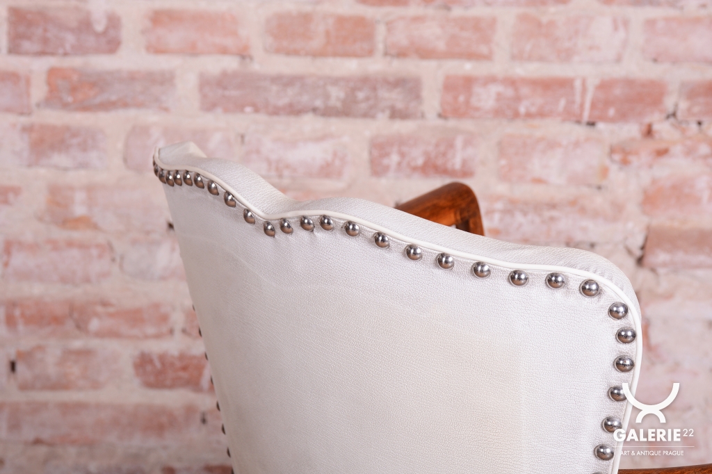 Konstrukce křesla je zhotovena z bukového masivu s krásným hřejivým tónem. Křeslo prošlo restaurováním a má oživenou polituru, která podtrhuje autenticitu a krásu dřeva. Je vybaveno tradičním čalouněním v umělé kůži, které je velmi dobře zachovalé a neprosezené, což zajišťuje maximální komfort.