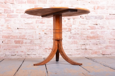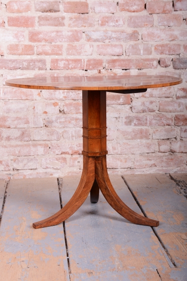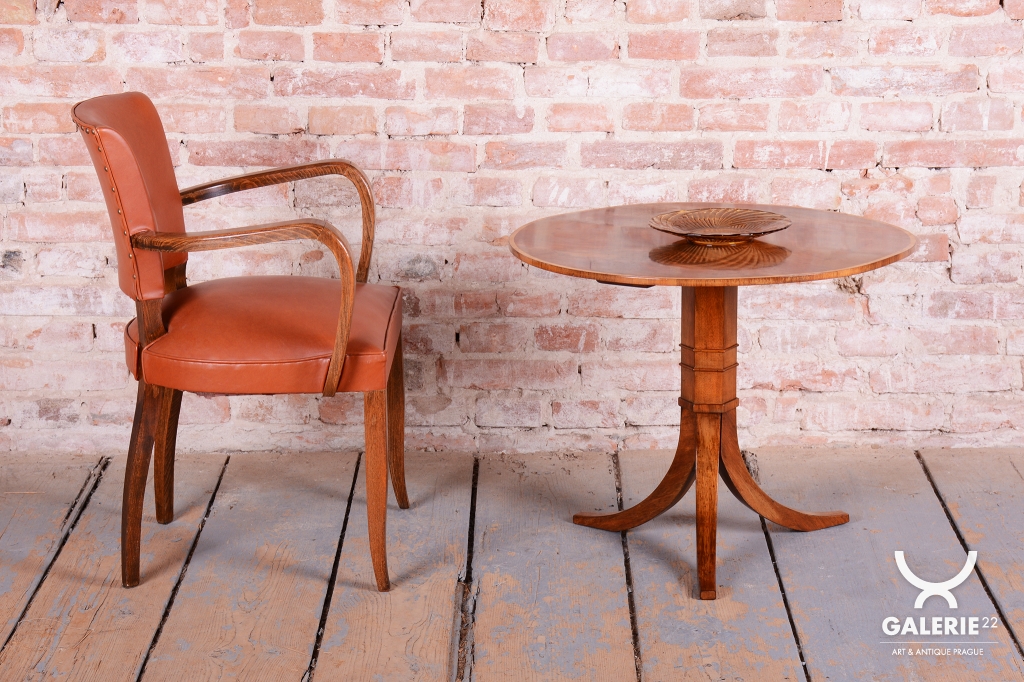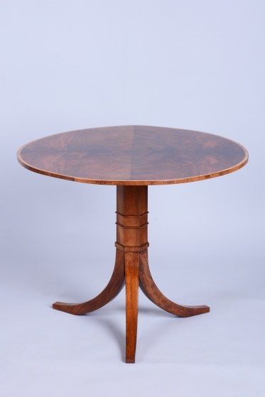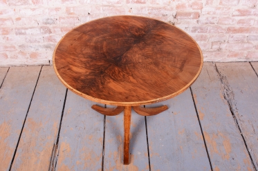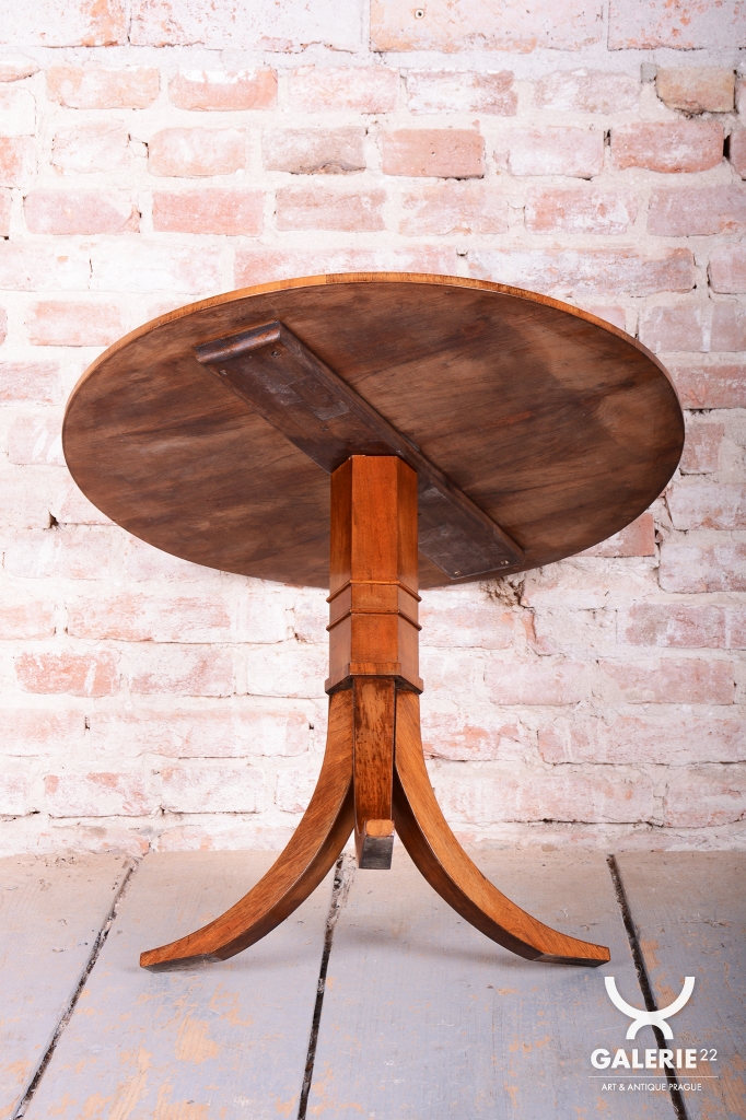 Tento elegantní kulatý stůl představuje vynikající ukázku nábytkářského umění z první poloviny 19. století, kdy byl vyroben v Rakousku. Stůl zaujme svou klasickou siluetou, která spočívá na robustní středové noze s trojbokou základnou, což zajišťuje jeho naprostou stabilitu. Celý povrch je opatřen ušlechtilou ořechovou dýhou, jejíž zrcadlově skládaná kresba na stolové desce vytváří působivý dekorativní obrazec, typický pro nejkvalitnější kusy tohoto období.