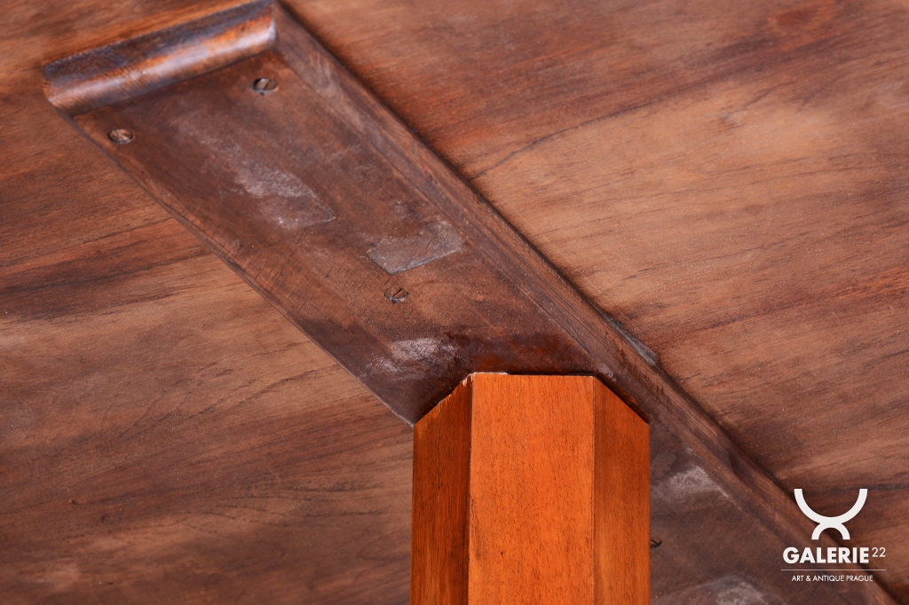V rámci procesu odborného restaurování byla citlivě oživena původní politura dřeva, díky čemuž ořechová dýha získala zpět svou hloubku a medově teplý odstín. Pečlivá renovace se soustředila na zachování historické patiny a zároveň na zpevnění celé konstrukce, která je nyní velmi stabilní a pevná. Stůl je tak připraven k okamžitému využití jako reprezentativní solitér, který podtrhne noblesu historického interiéru.