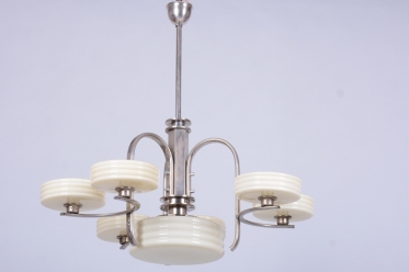 Tento impozantní salonní velký lustr představuje špičkovou ukázku československého designu 20. let 20. století. Svým tvaroslovím stojí na pomezí dvou zásadních směrů – dekorativního Art Deca a přísně funkčního Bauhausu. Tato unikátní syntéza se projevuje v harmonickém spojení geometrických linií a technické preciznosti, která byla typická pro moderní interiéry mladé republiky. Konstrukce z niklované oceli byla v rámci celkového restaurování profesionálně vyčištěna, čímž získala zpět svůj charakteristický chladný lesk, který v kombinaci s velkorysými rozměry dodává svítidlu nádech luxusu.