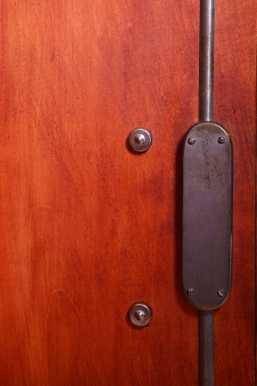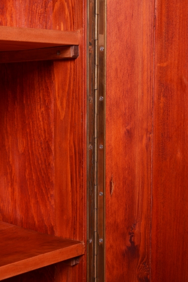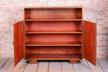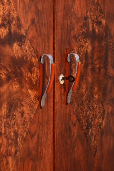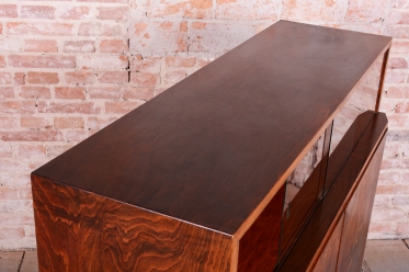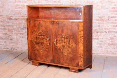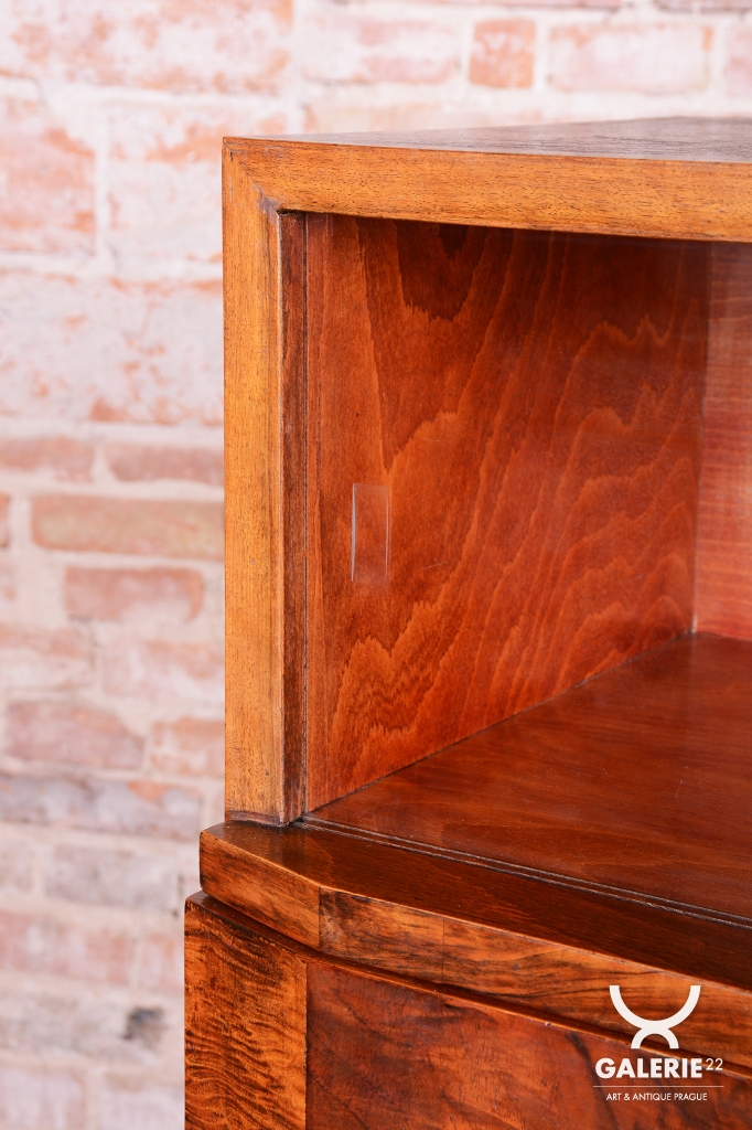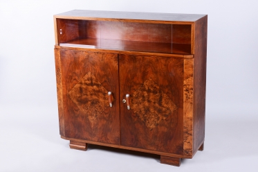 Horní část skříňky tvoří otevřený prostor s čirými šoupacími skly, který slouží k vystavení sběratelských předmětů nebo knih. V rámci odborného restaurování byla citlivě oživena původní politura dřeva, díky čemuž ořechová dýha i kořenice získaly zpět svou přirozenou hloubku, teplý odstín a hedvábný lesk. Původní madla s kovovými prvky ladí s celkovou estetikou a podtrhují autentický vzhled.