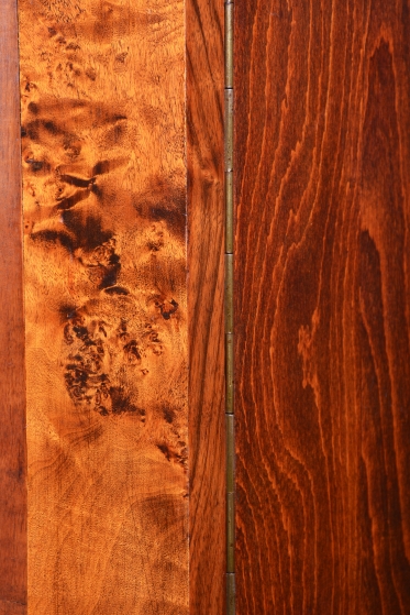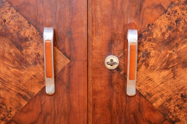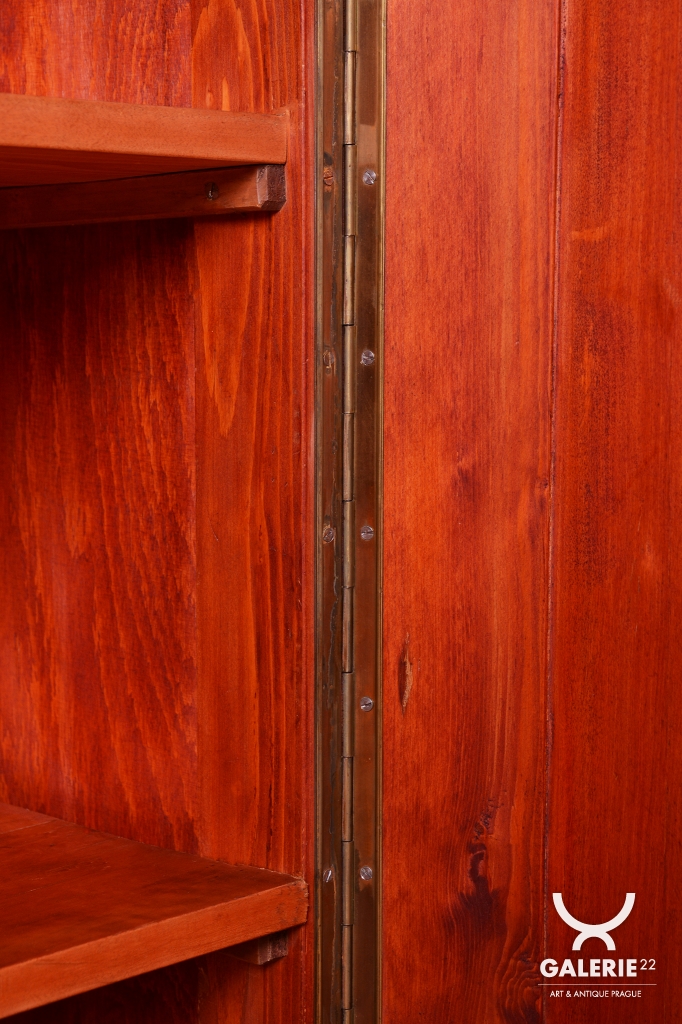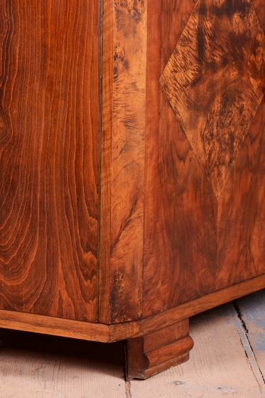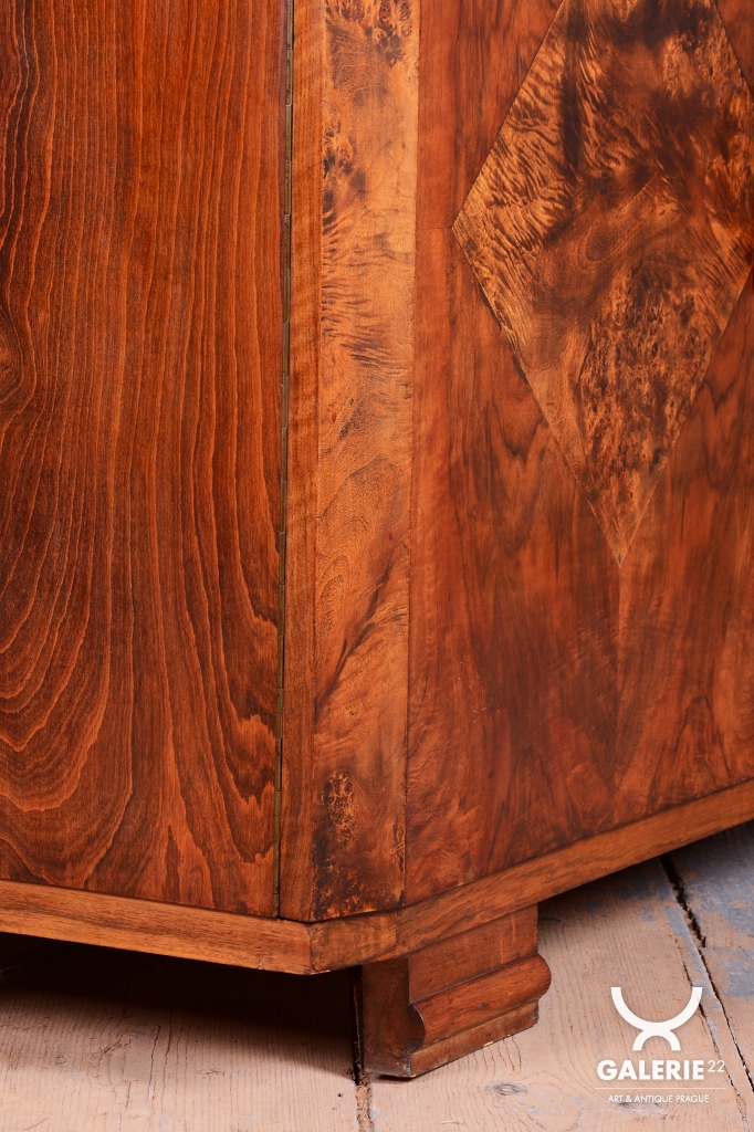 Tato luxusní komoda, sloužící jako stylová skříňka s vitrínou, je autentickým příkladem vytříbeného designu období Art Deco v Československu 30. let 20. století. Konstrukce z laťovky je precizně dýhována ořechem, přičemž čelní plocha dvířek je dekorována výraznou kořenicí skládanou do geometrického tvaru kosočtverce. Tento dekorativní prvek vytváří fascinující vizuální hru se strukturou dřeva, která je pro špičkový nábytek této éry typická.