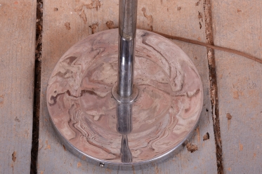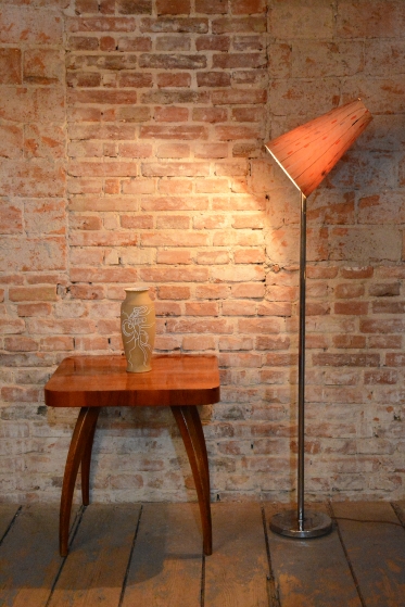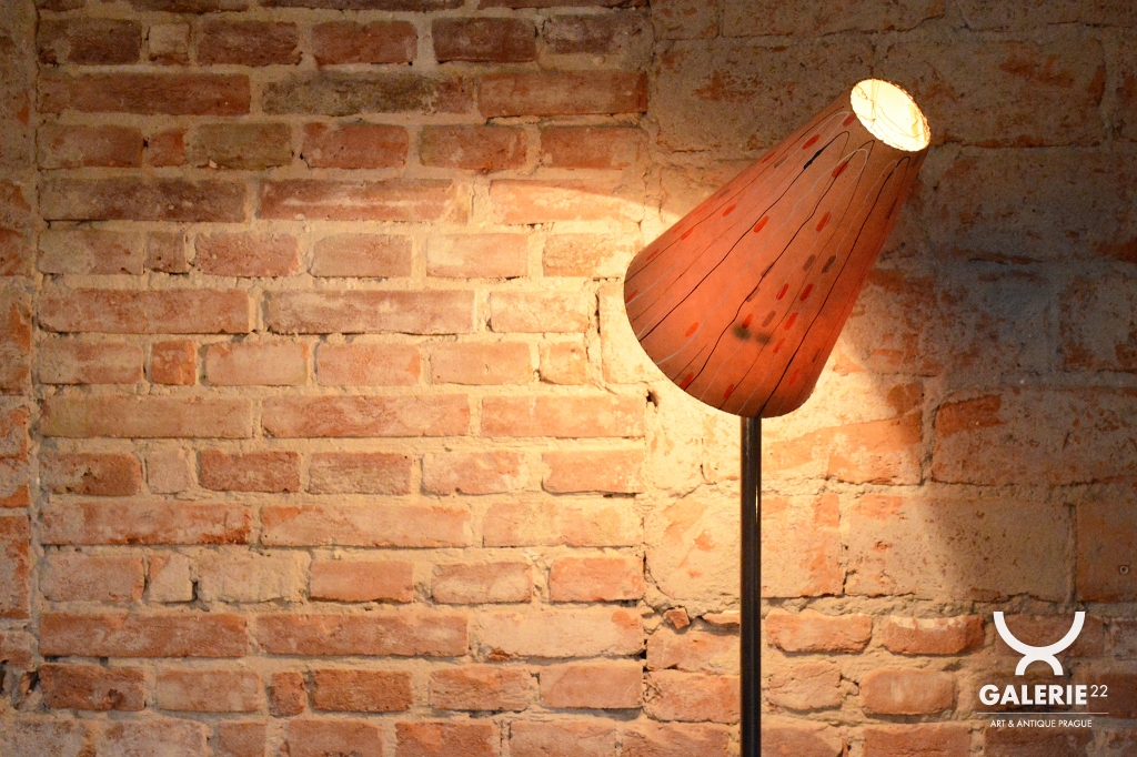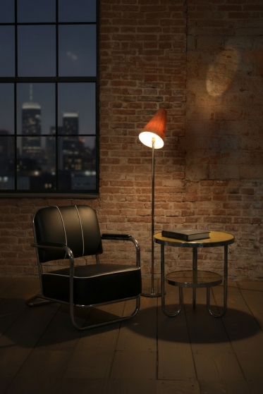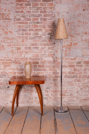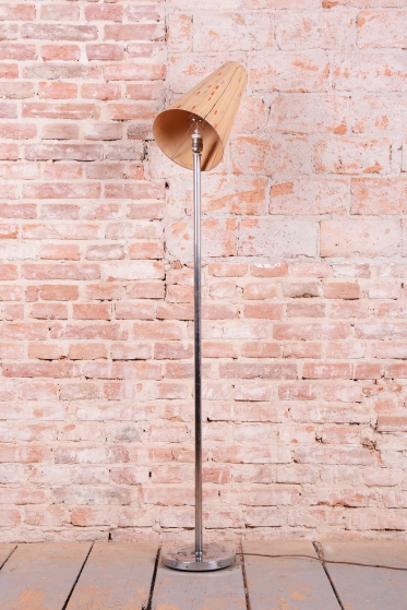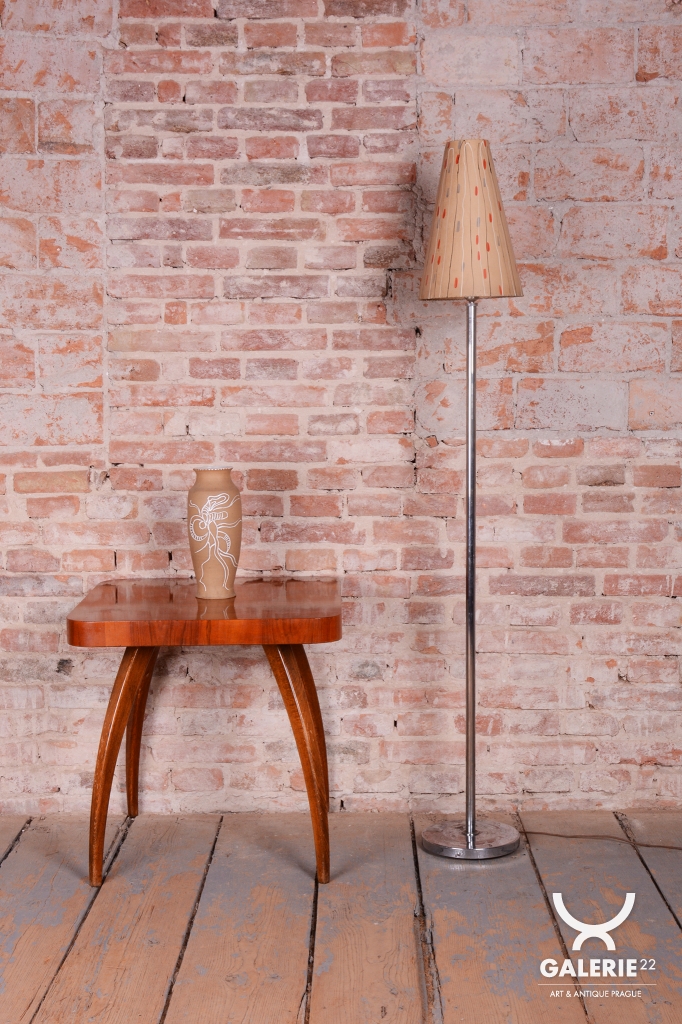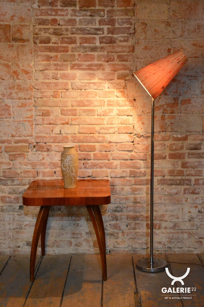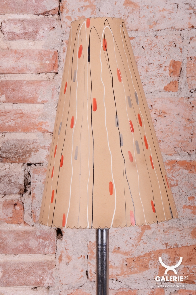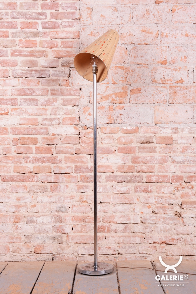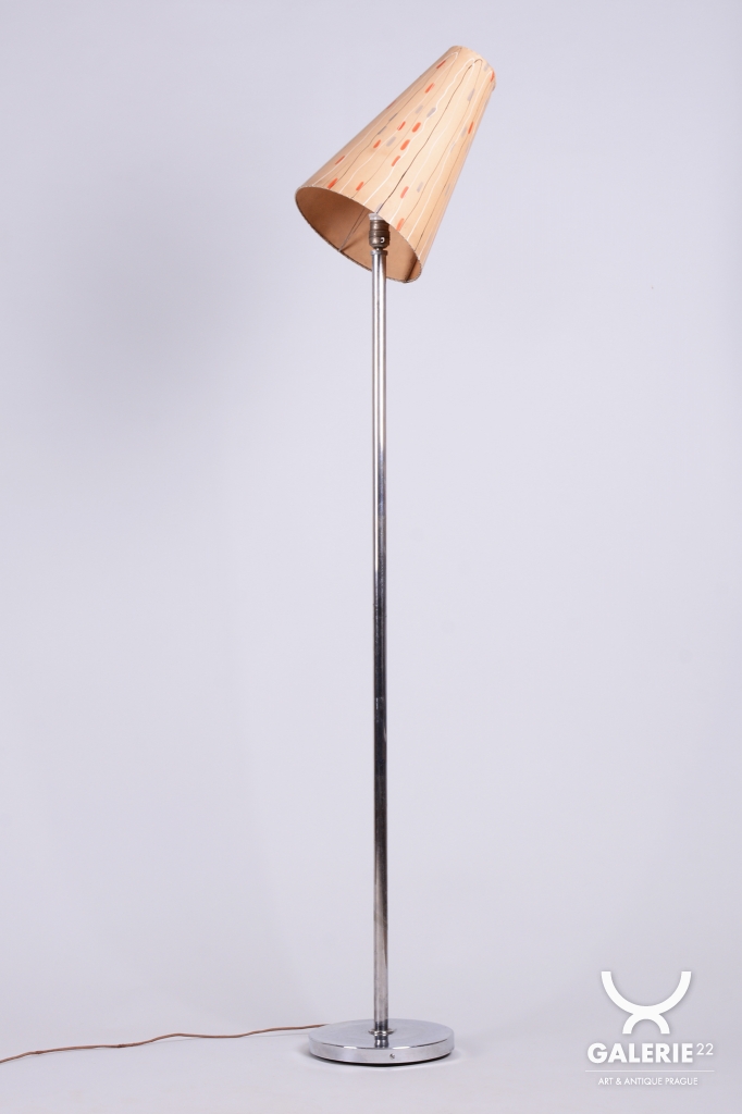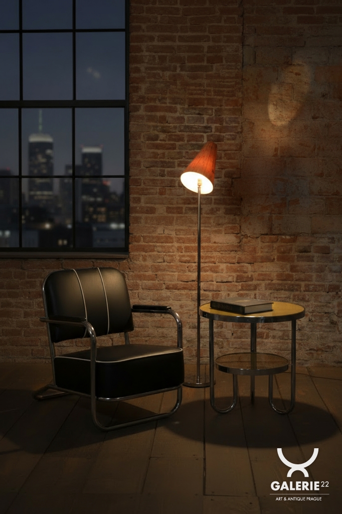 Tato zajímavá podlahová lampa představuje fascinující designové období 40. let 20. století, kdy se v Československu začala mísit přísná geometrie Bauhausu s prvními náznaky organičtějšího stylu Mid-Century. Svítidlo stojí na elegantní konstrukci z trubkové chromované oceli, která si i po letech zachovává svůj moderní výraz a vysoký lesk.