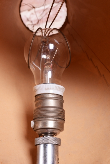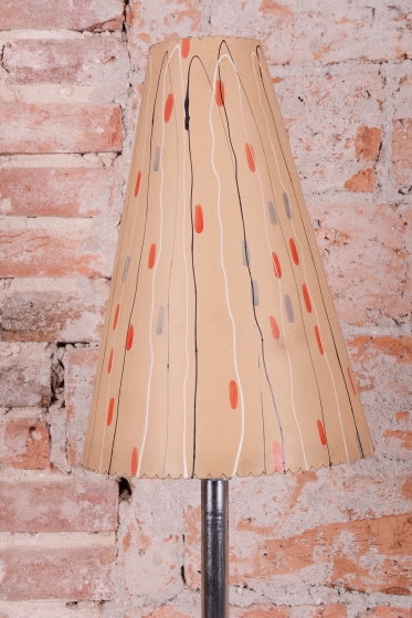 Naprostým unikátem a technickou zajímavostí tohoto modelu je chytré uchycení stínidla přímo na žárovku. Tento rafinovaný mechanismus plně nahrazuje klasický kloub, a přesto (nebo právě proto) umožňuje otáčení stínidla do všech směrů. Uživatel tak může světelný kužel velmi snadno a plynule směrovat podle aktuální potřeby. Lampa je osazena původním zachovalým stínidlem, které podtrhuje autenticitu a historickou hodnotu celého kusu. Je to ideální doplněk pro ty, kteří hledají funkční osvětlení s nápaditým technickým detailem.