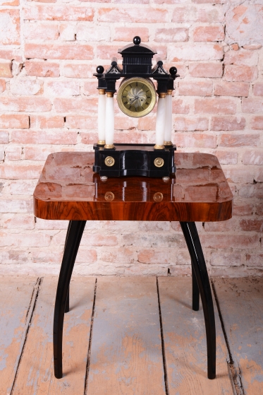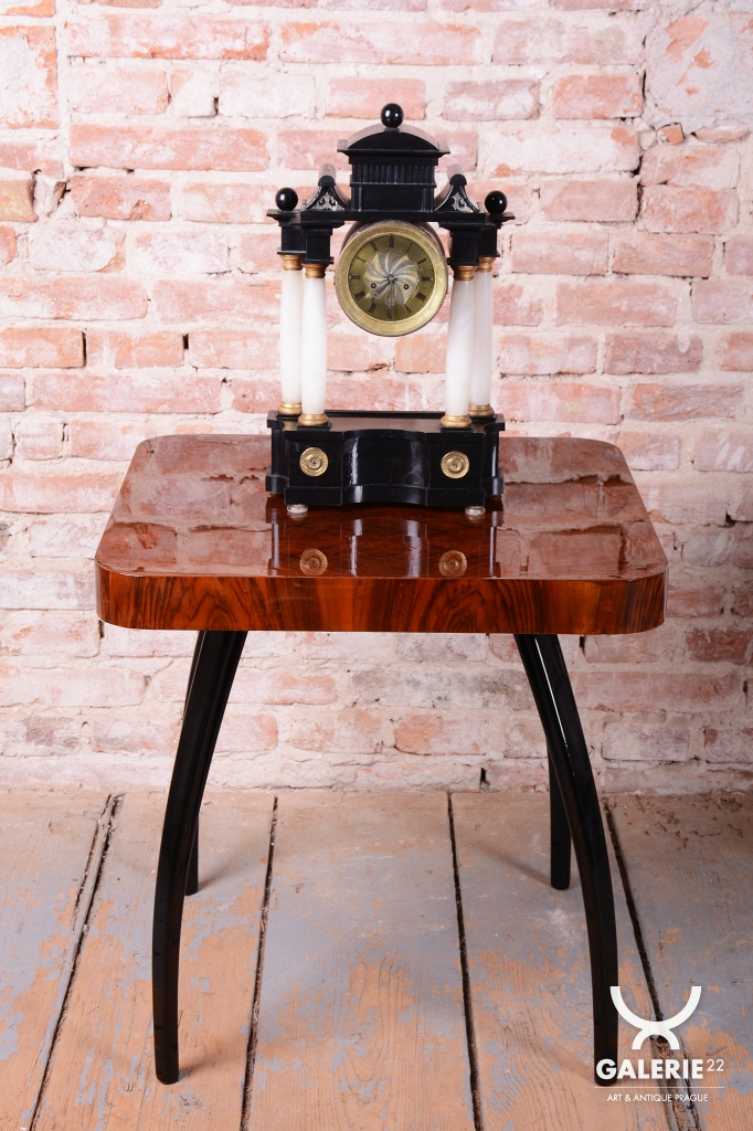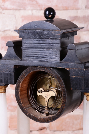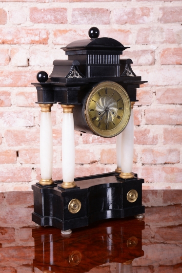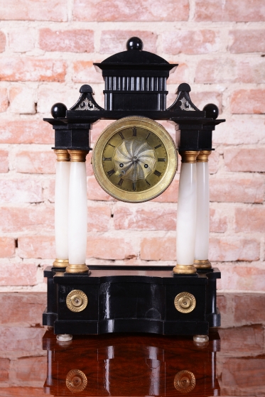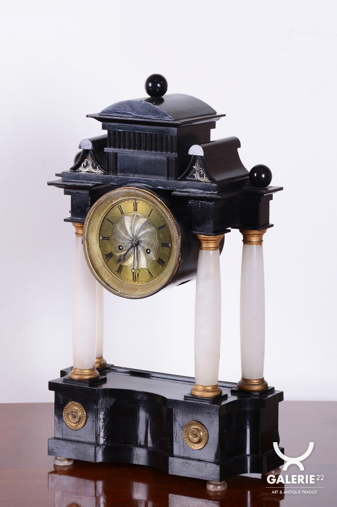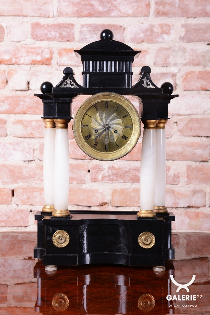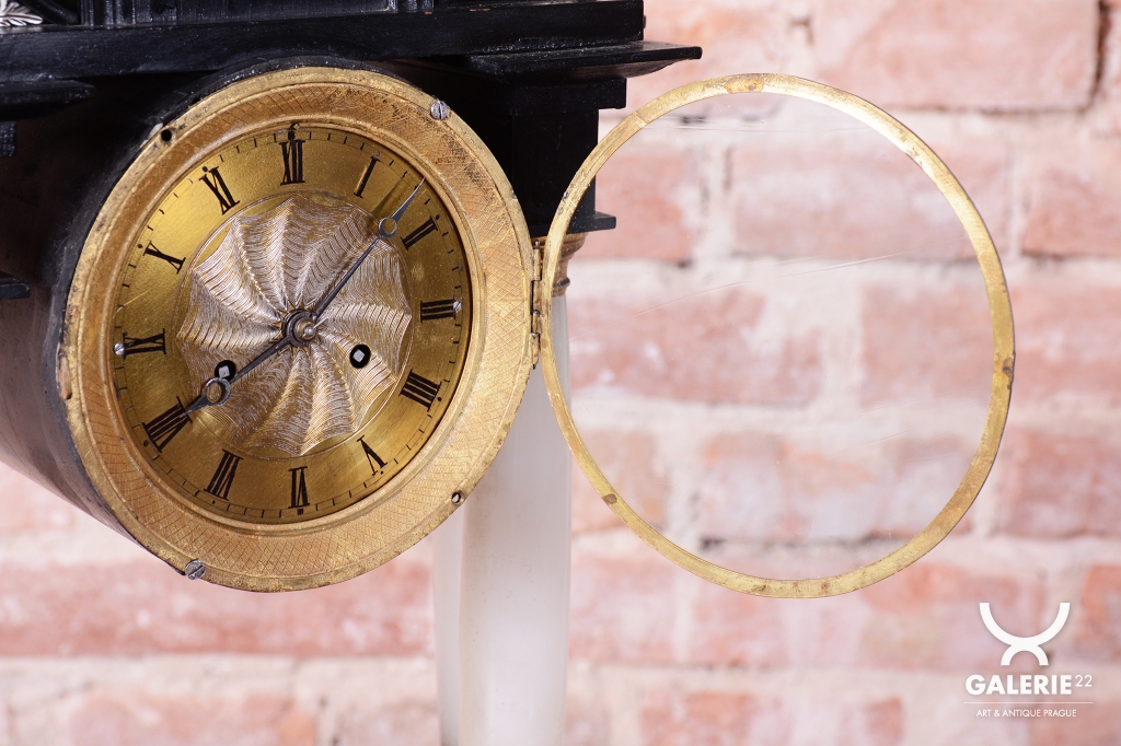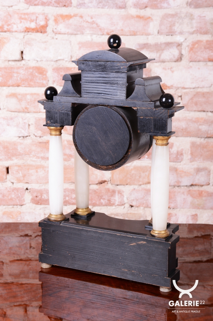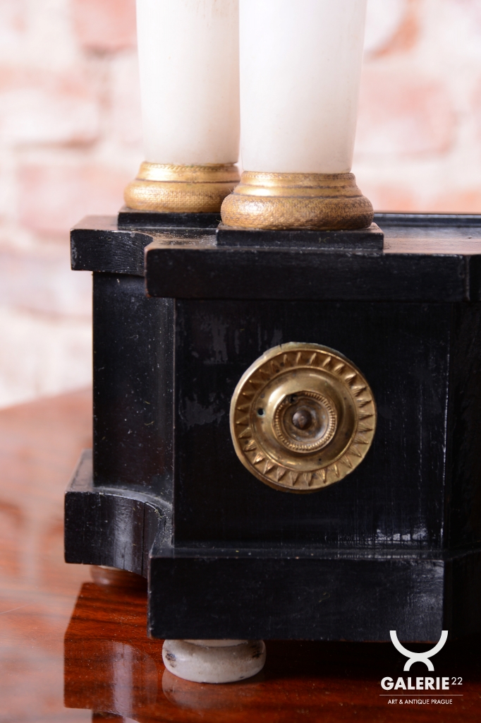 Pérové-natahují se klíčkem, chod 3-5 dní. Půlové bití (1/2) - bijí každých 30 min. Cizelovaný ciferník – mosaz. Sloupky z Alabastru. Cizelované mosazné ozdoby a perleť.