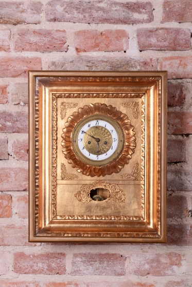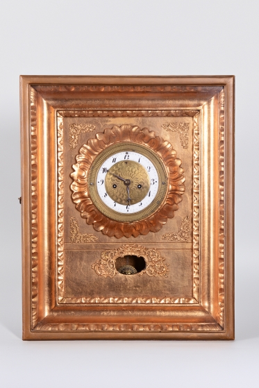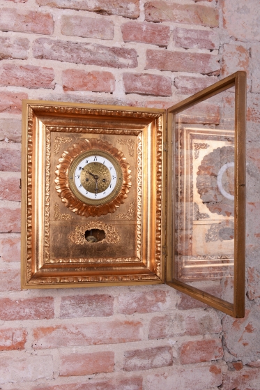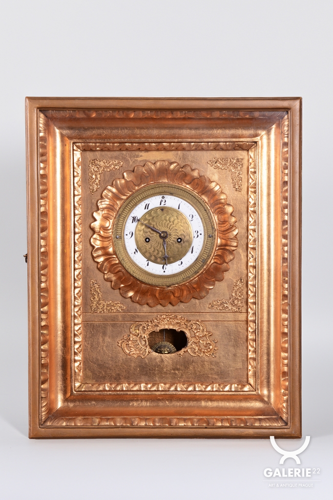 Věnec: Ciferník je vsazen do velkého, kruhového, bohatě reliéfního věnce ve tvaru slunce nebo paprsků, což je velmi oblíbený motiv v období Empíru (slunce jako symbol monarchie/síly).