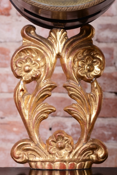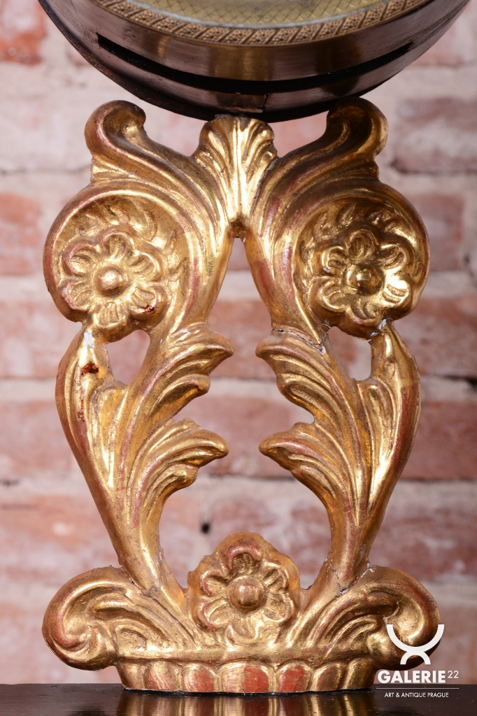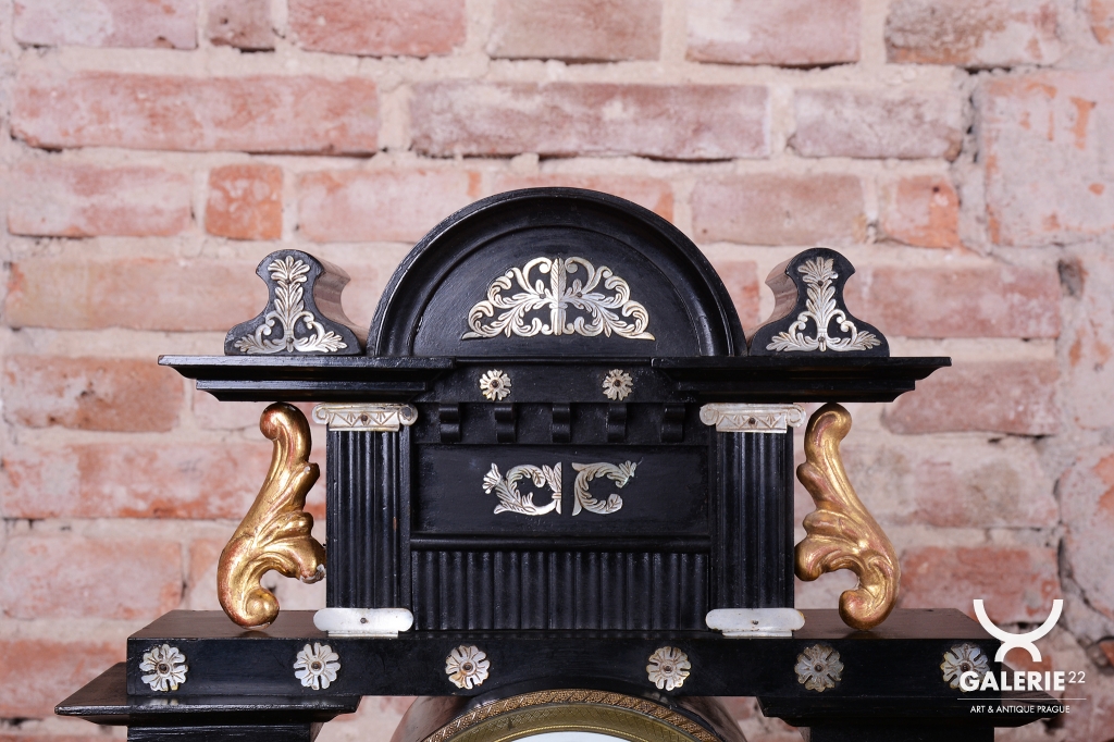 Ozdoby polychrom zlacené plátkovým zlatem a perleť.