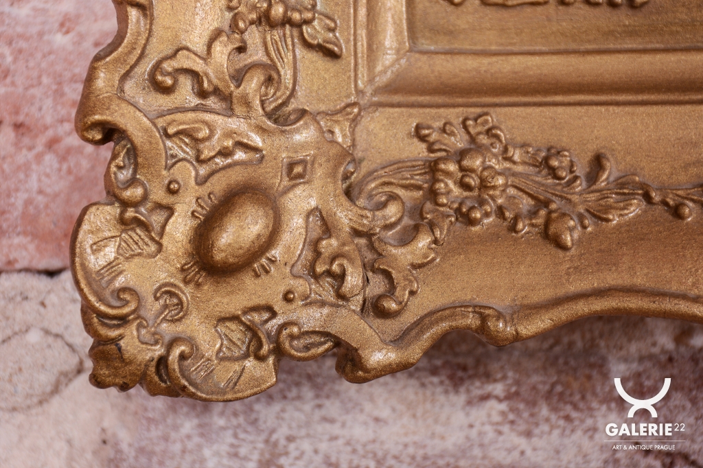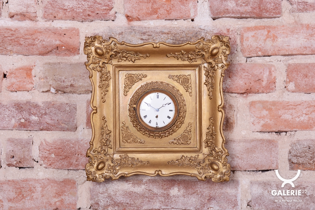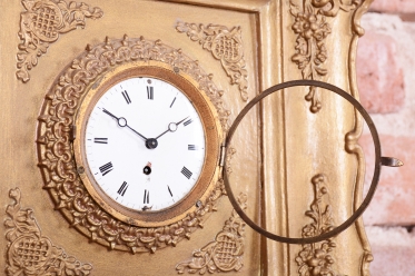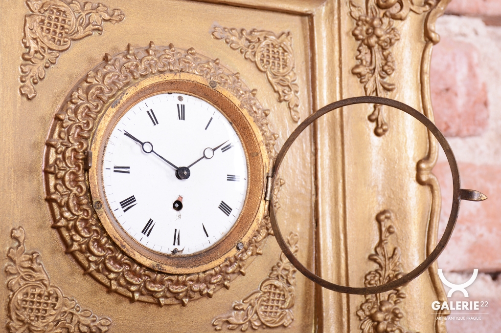 Věnec: Ciferník je vsazen do velkého, kruhového, bohatě reliéfního věnce ve tvaru slunce nebo paprsků, což je velmi oblíbený motiv v období Empíru (slunce jako symbol monarchie/síly).