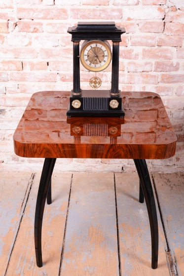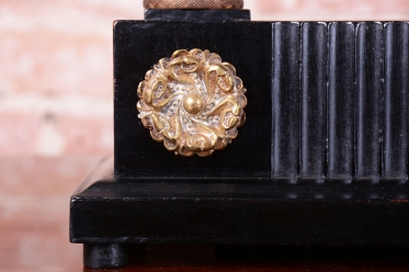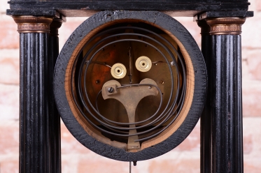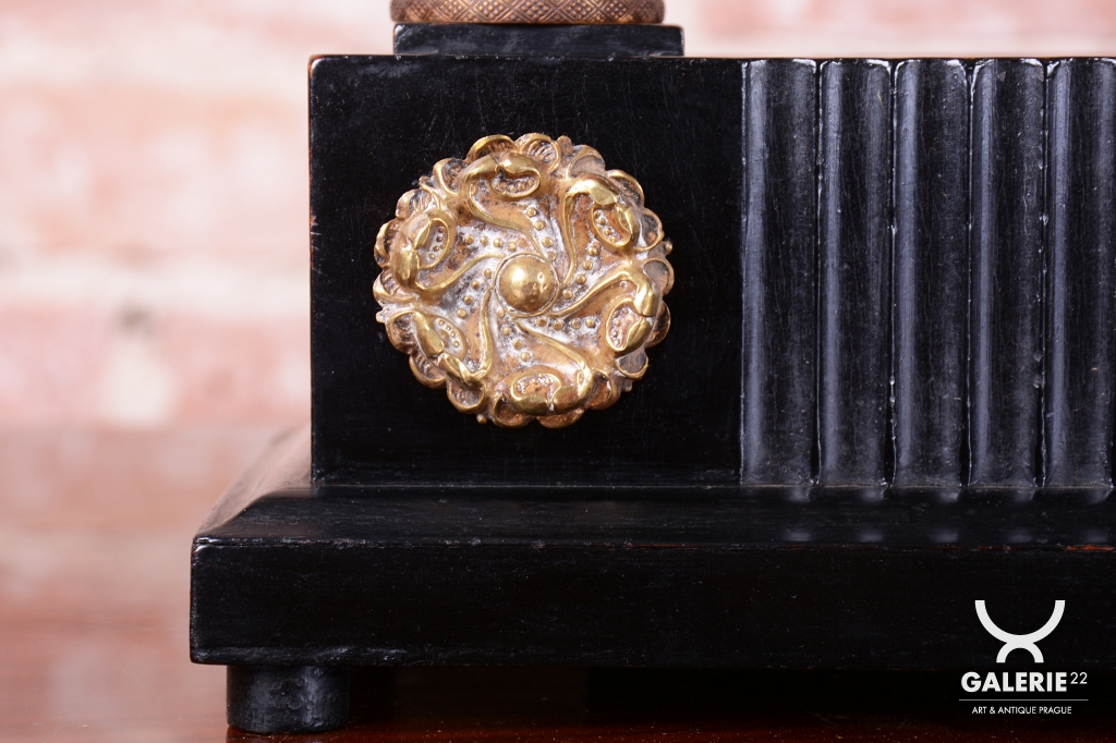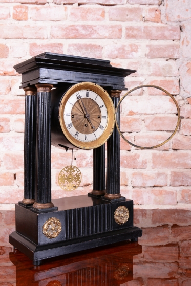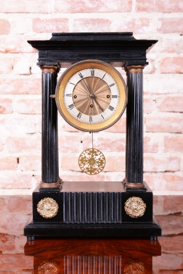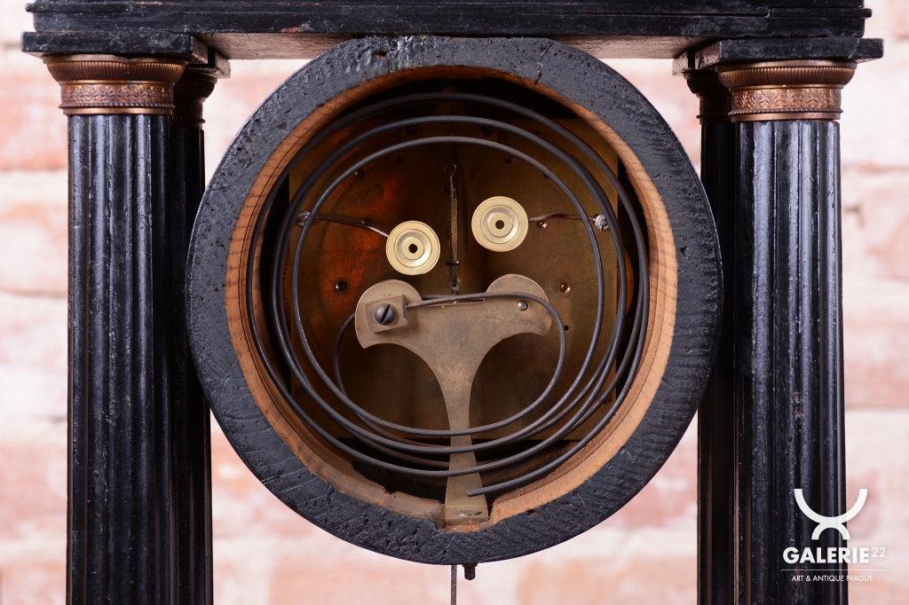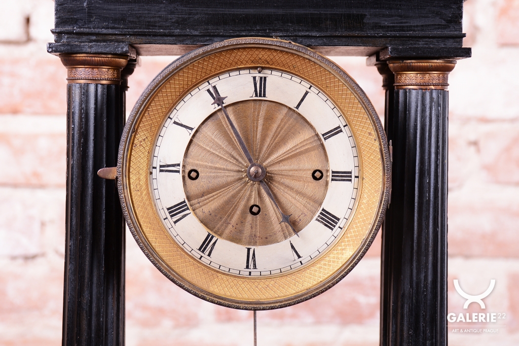 Pérové-natahují se klíčkem, chod 3-5 dní. Čtvrťové bití - 1/4 - bijí každých 15 min. Cizelované kyvadlo, věnec a ciferník v kombinaci se smaltem. Mosazné apliky - ozdoby.