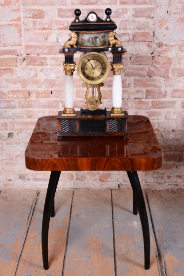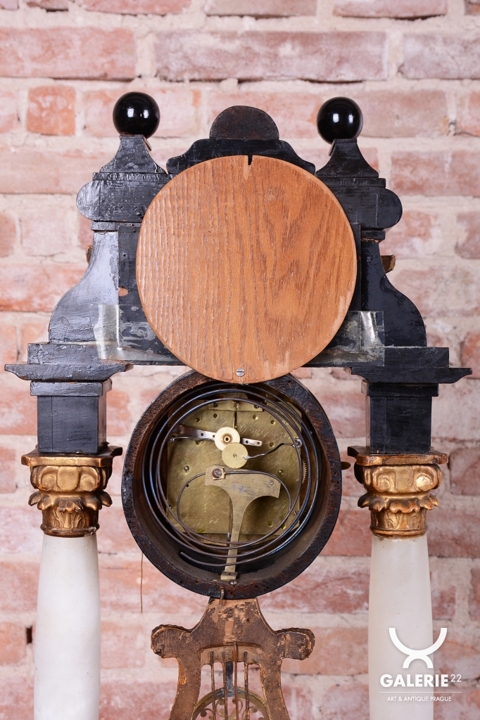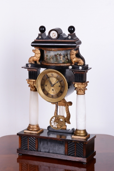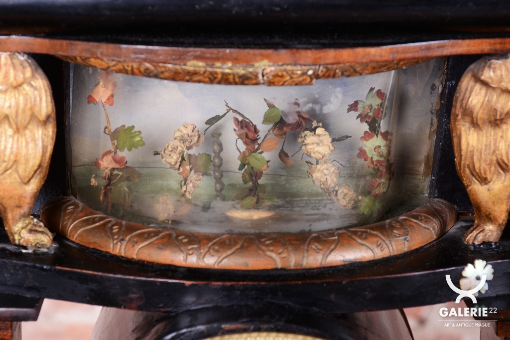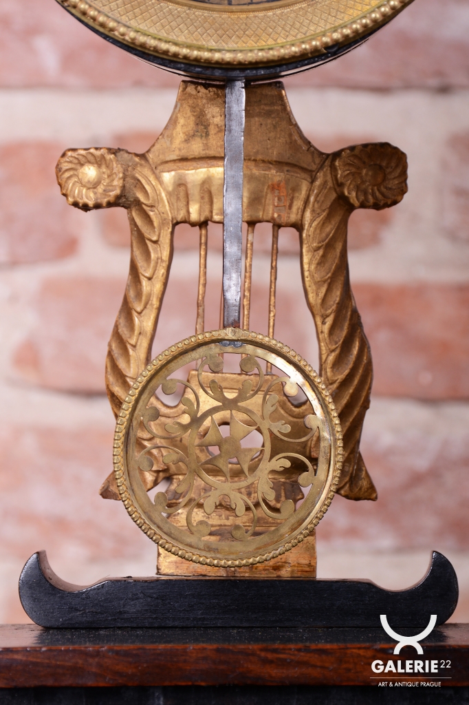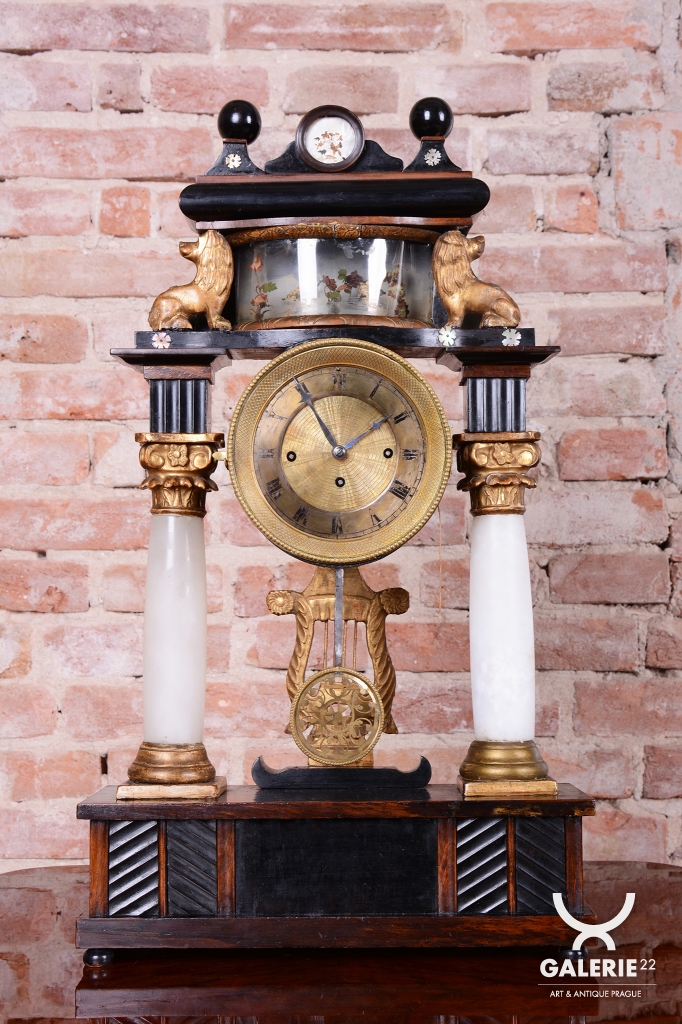 Tento prvek slouží k rozptýlení a je typickým dekoračním prvkem empíru, který kladl důraz na domácí a citové hodnoty. Stejně tak jako zlaté figurky lvů na horní římse, (symbol síly a moci) a zlacená lyra zavěšená pod ciferníkem nebo korintské hlavice - zdobné hlavice sloupů.