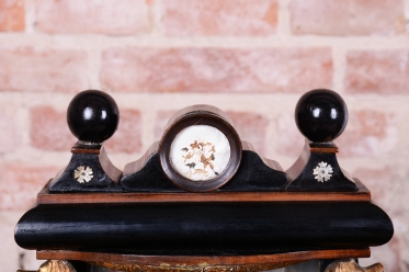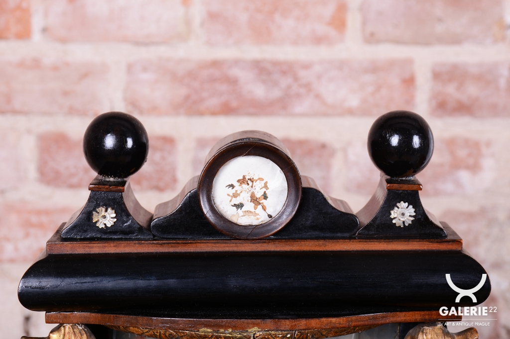Rámeček uprostřed horní části (nad ciferníkem) je miniaturní diorama / scénka: Jedná se o malou dekorativní vitrínu, kde jsou umístěny drobné trojrozměrné dekorace (květiny, lístky, keře), často vyrobené z kusu mušle, vosku, hedvábí nebo dobarveného papíru.