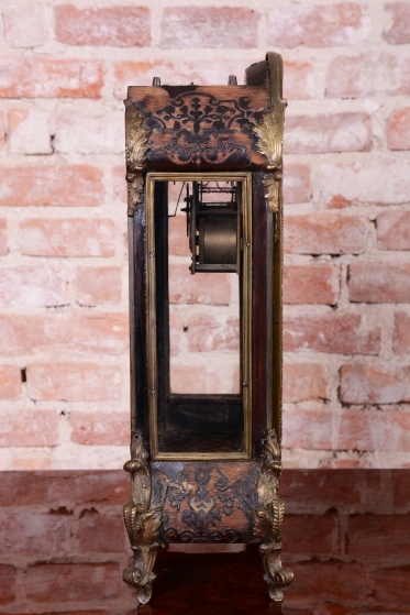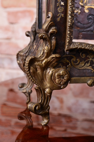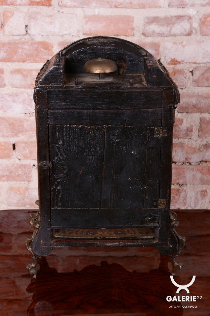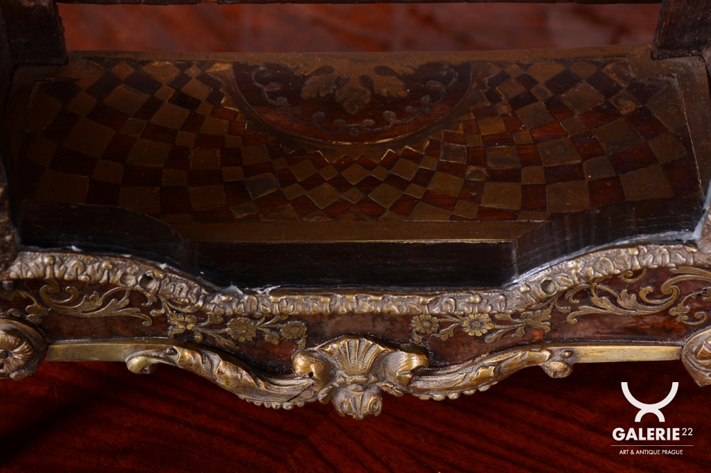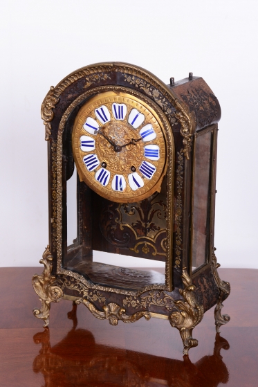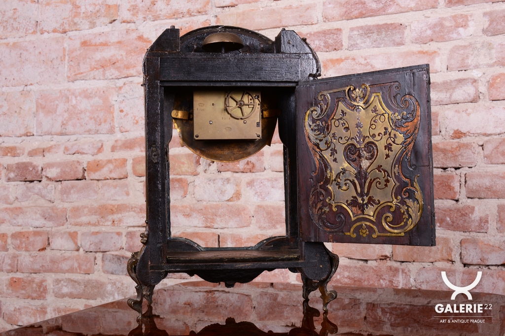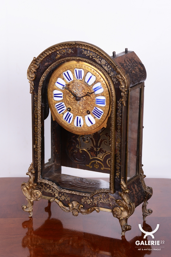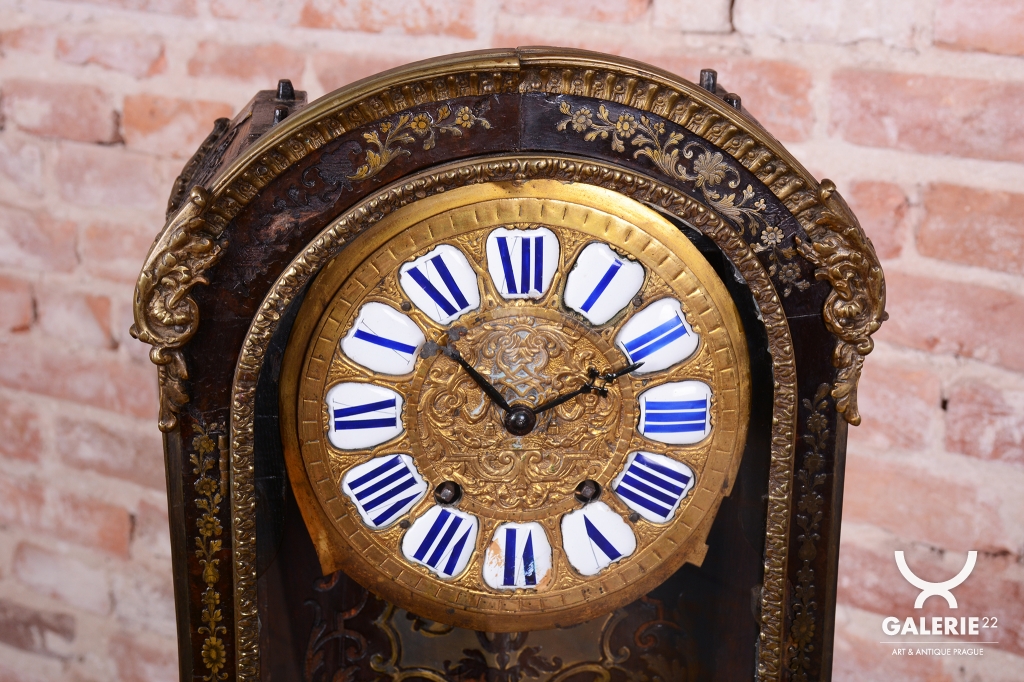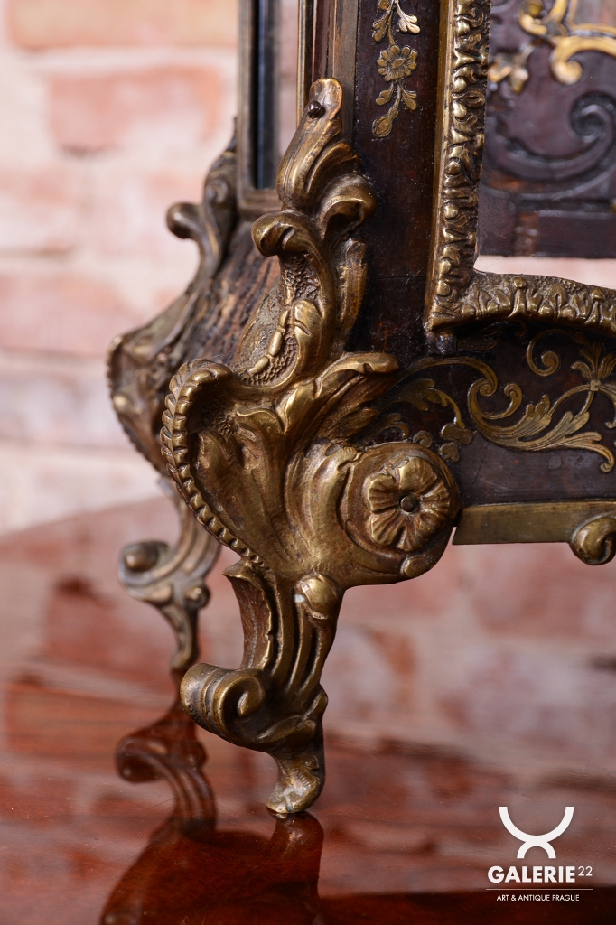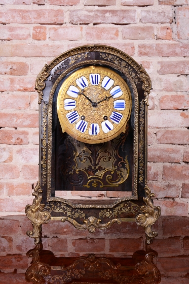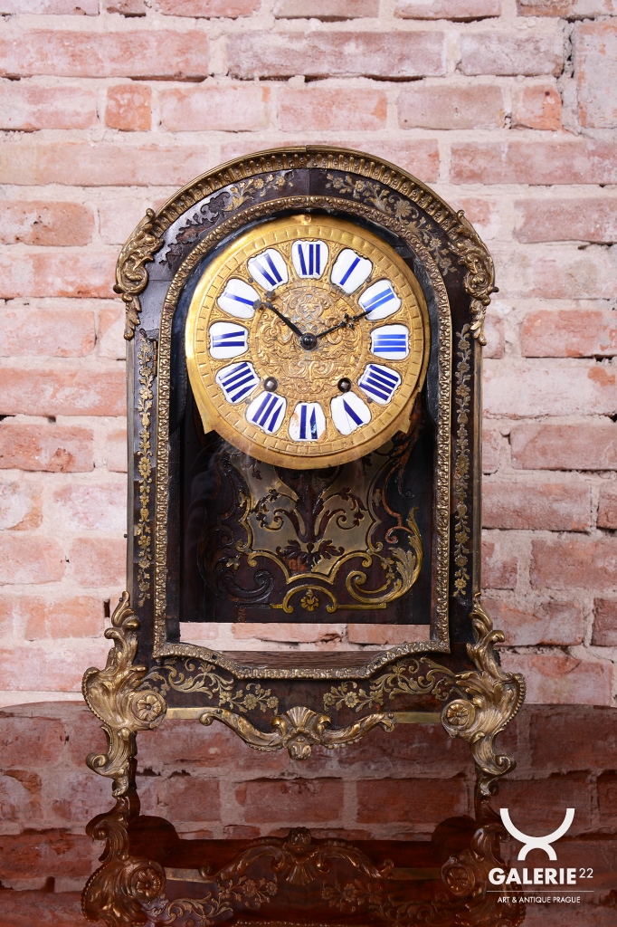 Boulle (Bulovky) Termín Boulle odkazuje na luxusní techniku zdobení pouzder hodin a nábytku, která nese jméno svého tvůrce: André-Charles Boulle (1642–1732), slavný ebenista a dvorní truhlář krále Ludvíka XIV. ve Francii. Jde o speciální a náročnou techniku intarzie (vykládání), známou jako marqueterie Boulle. Materiály se vyřezávají do složitých ornamentálních vzorů (florální motivy, úponky, maskarony) a skládají do sebe. Zlacené mosazné aplikace, okraje pouzdra a nožky jsou bohatě zdobeny plastickými zlacenými kovovými prvky (tzv. ormolu), které zdůrazňují barokní tvary.