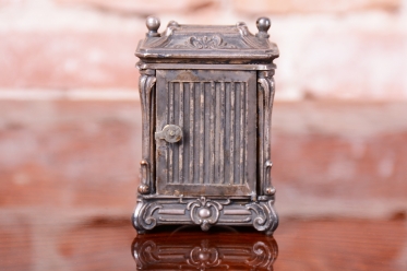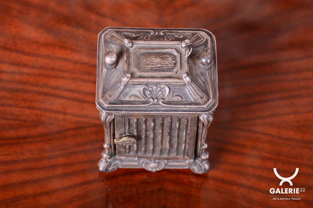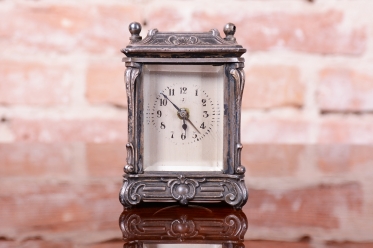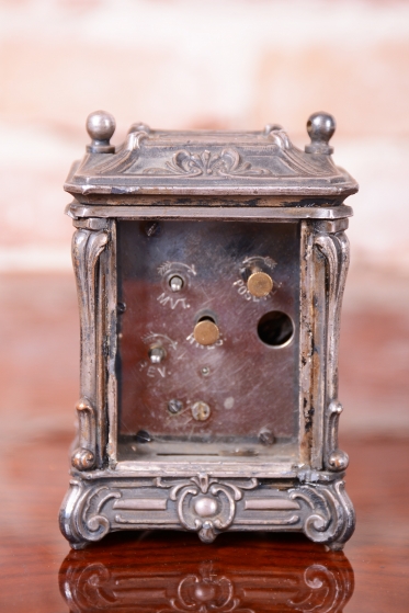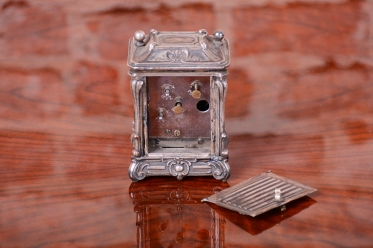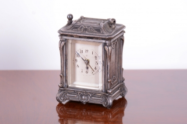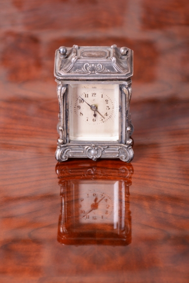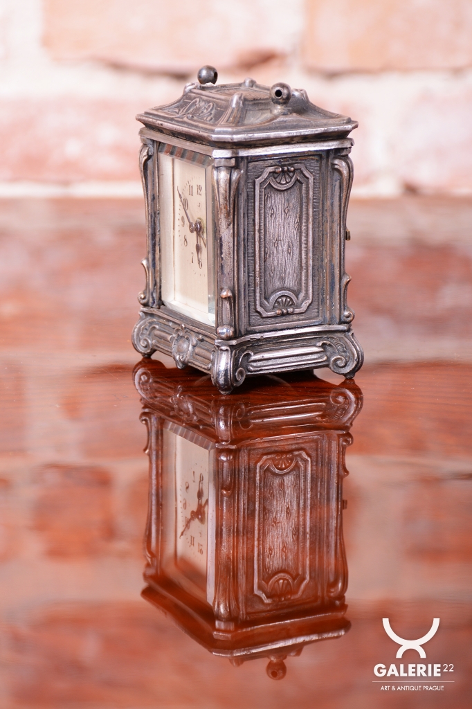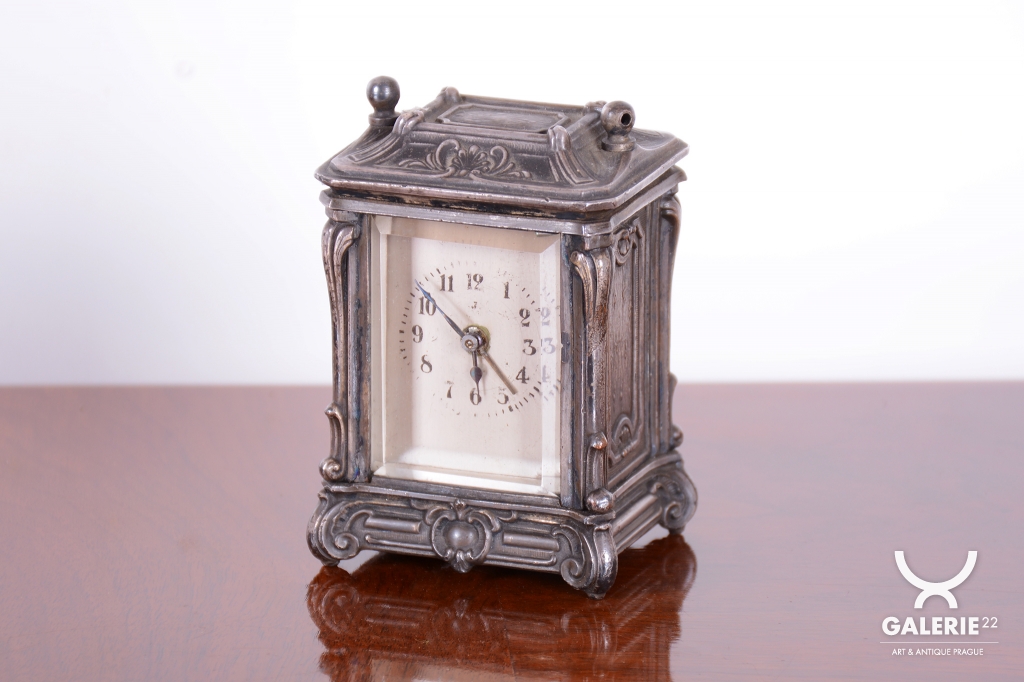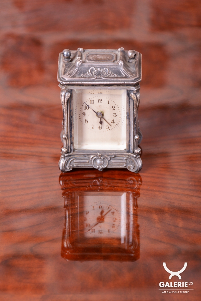 Původní zkosené sklo, postříbřený ciferník s černými arabskými číslicemi.