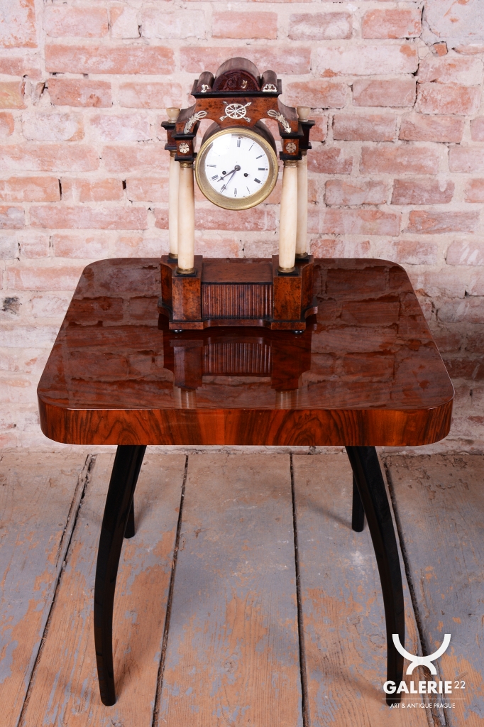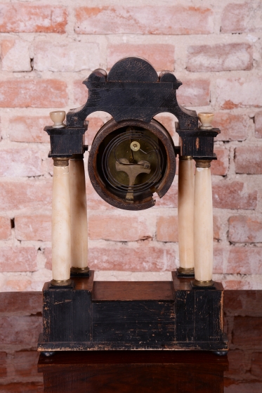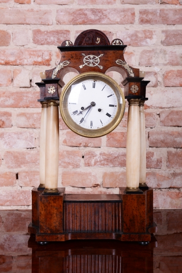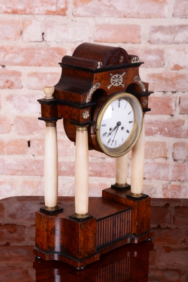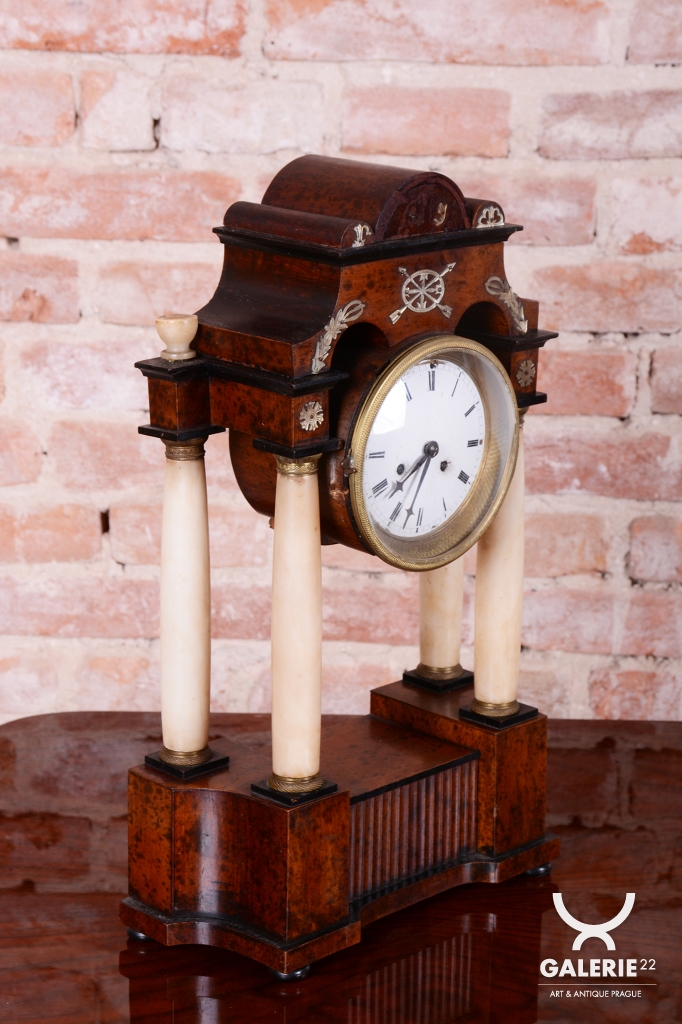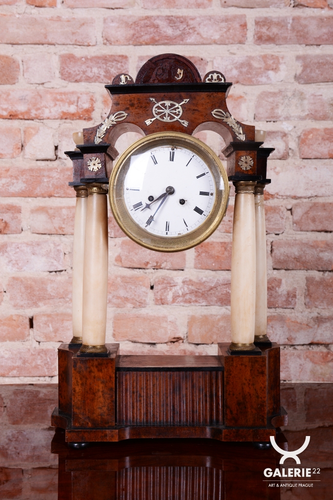Pérové-natahují se klíčkem, chod 3-5 dní. Půlové bití (1/2) - bijí každých 30 min. Sloupky z Alabastru. Skříňka - kořenice. Mosazný, cizelovaný rámeček a apliky Ozdoby - perleť. Ciferník smalt.