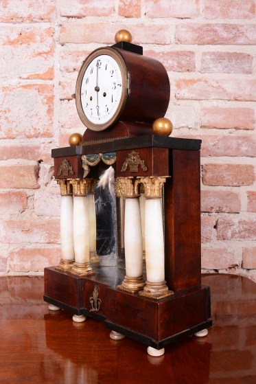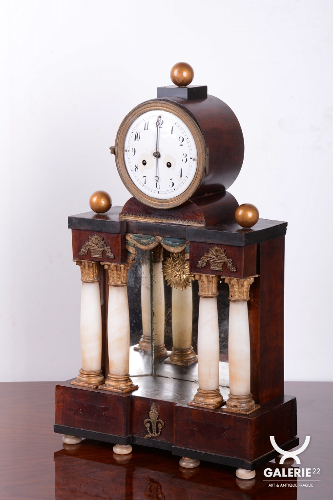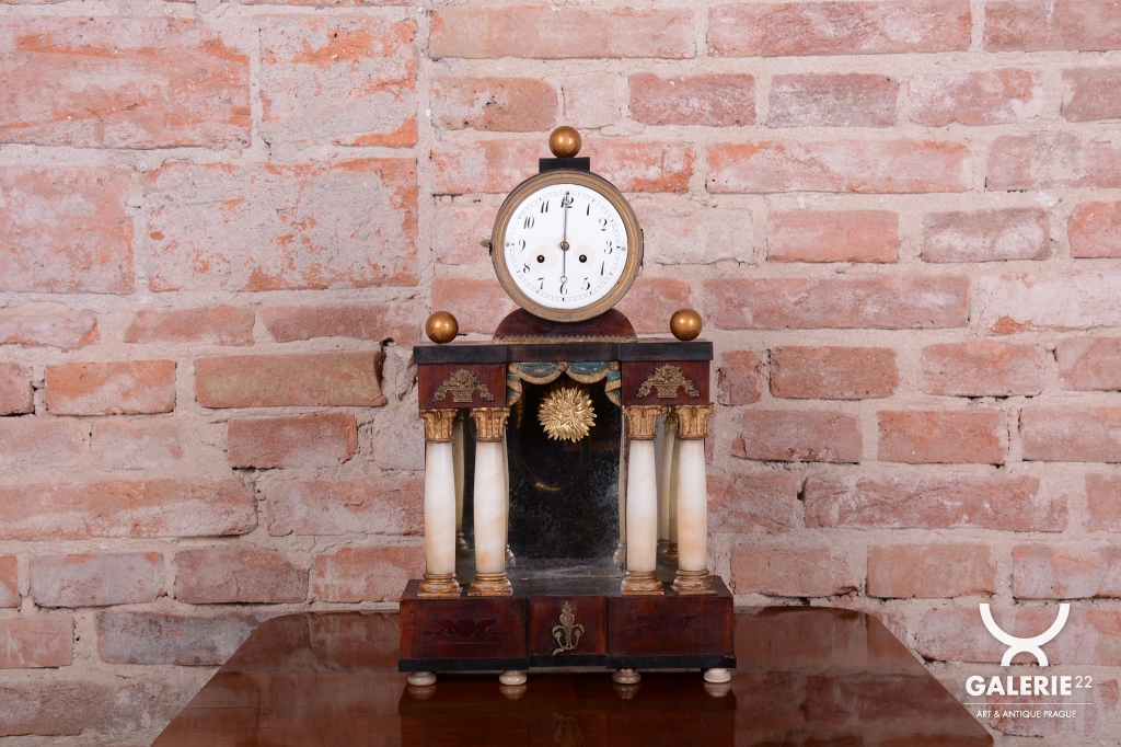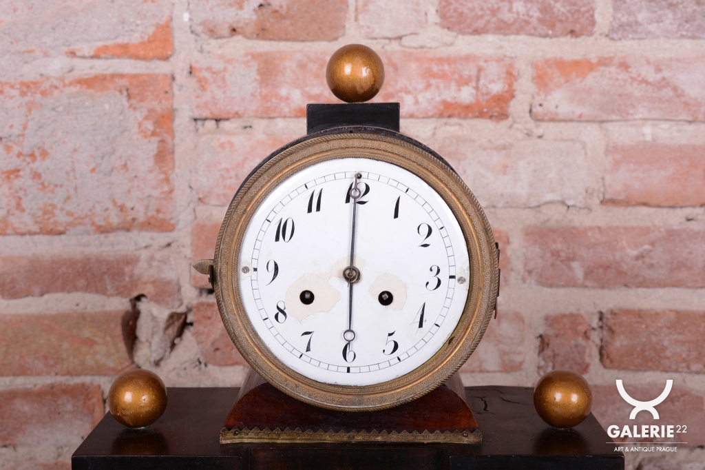 Cizelované mosazné ozdoby, kyvadlo a rámeček.