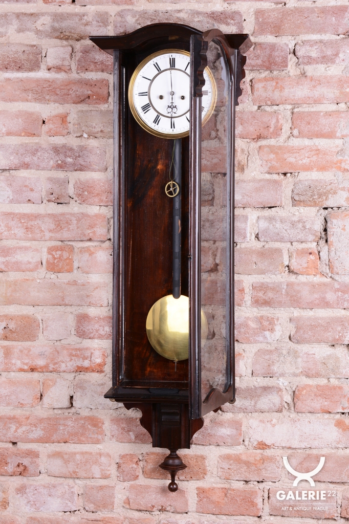 Týdenní stroj - půlové bití (1/2) - odbijí každých 30 min. Dvou-závažové hodiny. Ciferník smalt Věneček a kyvadlo - mosaz