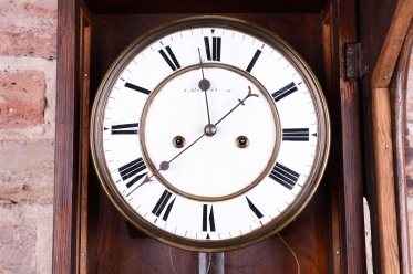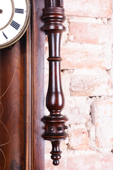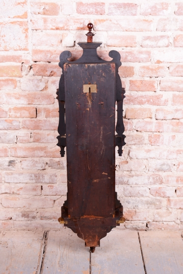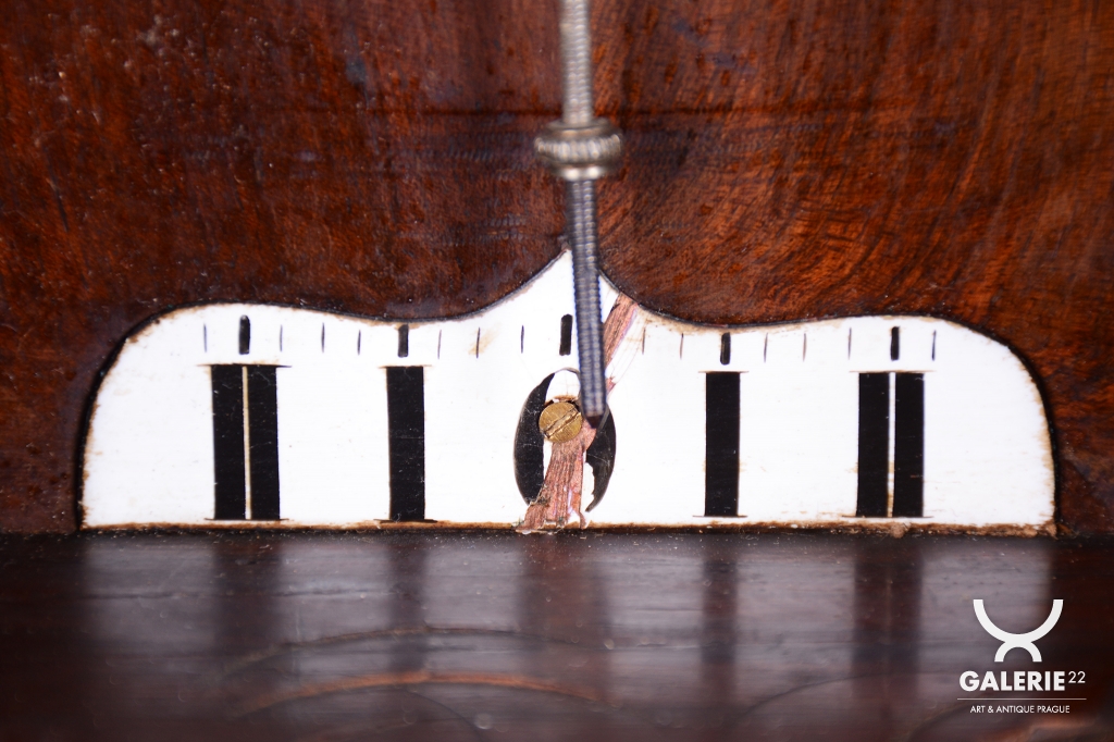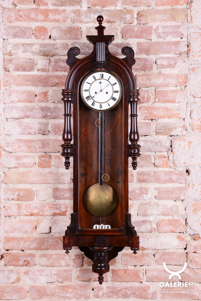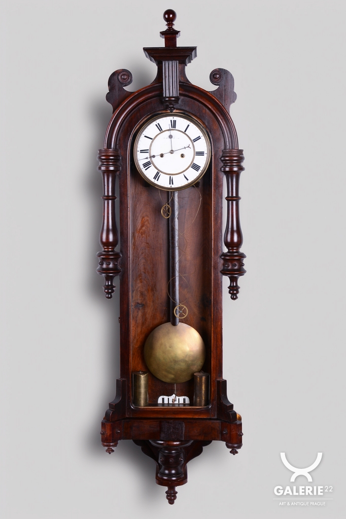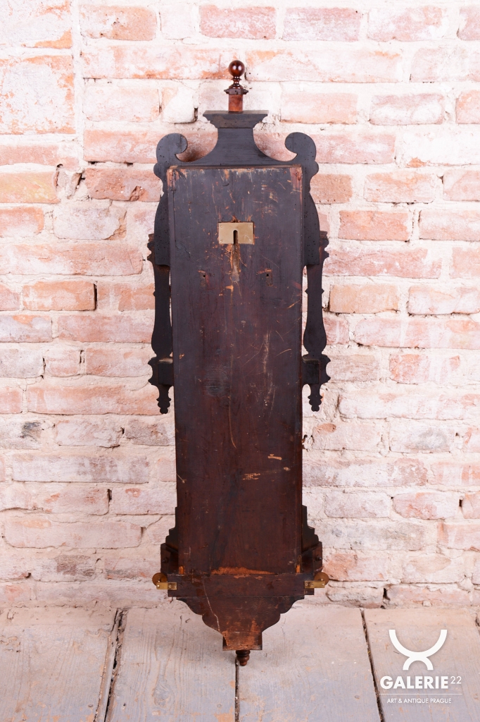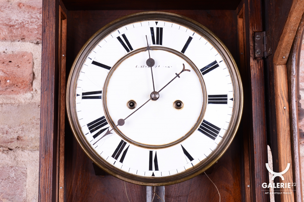 Týdenní stroj. Půlové bití (1/2) - bijí každých 30 min. Dvou-závažové hodiny. Ciferník smalt. Mosazný rámeček a kyvadlo. Bohatě zdobené tělo hodin včetně koruny.
